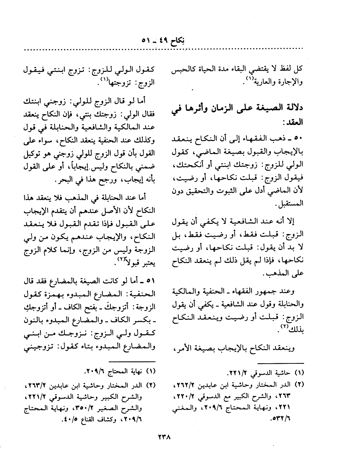 51 - أَمَّا لَوْ كَانَتِ الصِّيغَةُ بِالْمُضَارِعِ فَقَدْ قَال الْحَنَفِيَّةُ: الْمُضَارِعُ الْمَبْدُوءُ بِهَمْزَةٍ كَقَوْل الزَّوْجَةِ: أَتَزَوَّجُكَ - بِفَتْحِ الْكَافِ - أَوْ أَتَزَوَّجُكِ - بِكَسْرِ الْكَافِ - وَالْمُضَارِعُ الْمَبْدُوءُ بِالنُّونِ كَقَوْل وَلِيِّ الزَّوْجِ: نُزَوِّجُكِ مِنَ ابْنِي وَالْمُضَارِعُ الْمَبْدُوءُ بِتَاءٍ كَقَوْل: تُزَوِّجِينِي