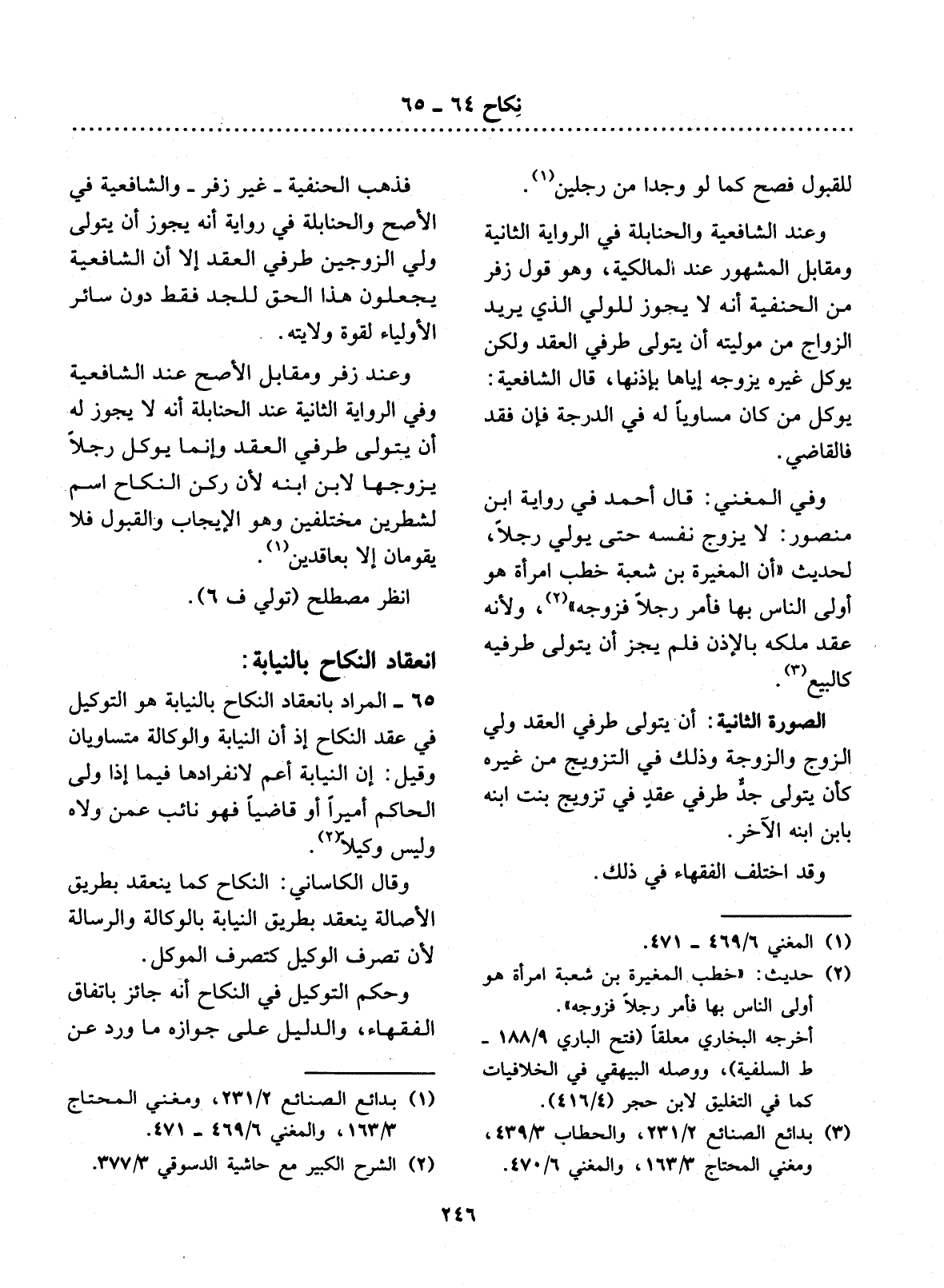 65 - الْمُرَادُ بِانْعِقَادِ النِّكَاحِ بِالنِّيَابَةِ هُوَ التَّوْكِيل فِي عَقْدِ النِّكَاحِ إِذْ أَنَّ النِّيَابَةَ وَالْوِكَالَةَ مُتَسَاوِيَانِ وَقِيل: إِنَّ النِّيَابَةَ أَعَمُّ لاِنْفِرَادِهَا فِيمَا إِذَا وَلَّى الْحَاكِمُ أَمِيرًا أَوْ قَاضِيًا فَهُوَ نَائِبٌ عَمَّنْ وَلاَّهُ وَلَيْسَ وَكِيلاً (2) .