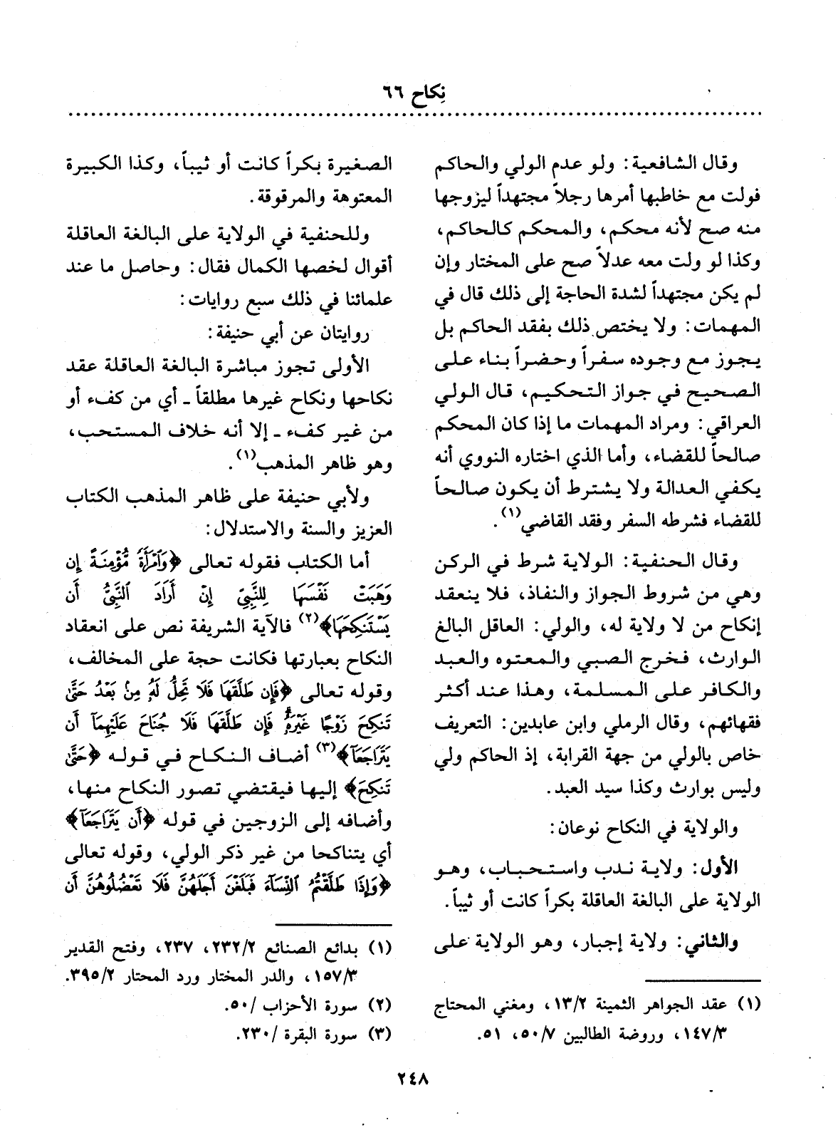 أَمَّا الْكِتَابُ فَقَوْلُهُ تَعَالَى {وَامْرَأَةٌ مُؤْمِنَةٌ إِنْ وَهَبَتْ نَفْسَهَا لِلنَّبِيِّ إِنْ أَرَادَ النَّبِيُّ أَنْ يَسْتَنْكِحَهَا (2) } ، فَالآْيَةُ الشَّرِيفَةُ نَصٌّ عَلَى انْعِقَادِ النِّكَاحِ بِعِبَارَتِهَا فَكَانَتْ حُجَّةً عَلَى الْمُخَالِفِ، وَقَوْلُهُ تَعَالَى {فَإِنْ طَلَّقَهَا فَلاَ تَحِل لَهُ مِنْ بَعْدُ حَتَّى تَنْكِحَ زَوْجًا غَيْرَهُ فَإِنْ طَلَّقَهَا فَلاَ جُنَاحَ عَلَيْهِمَا أَنْ يَتَرَاجَعَا (3) } أَضَافَ النِّكَاحَ فِي قَوْلِهِ {حَتَّى تَنْكِحَ} إِلَيْهَا فَيَقْتَضِي تَصَوُّرَ النِّكَاحِ مِنْهَا، وَأَضَافَهُ إِلَى الزَّوْجَيْنِ فِي قَوْلِهِ {أَنْ يَتَرَاجَعَا} ، أَيْ يَتَنَاكَحَا مِنْ غَيْرِ ذِكْرِ الْوَلِيِّ، وَقَوْلُهُ تَعَالَى {وَإِذَا طَلَّقْتُمُ النِّسَاءَ فَبَلَغْنَ أَجَلَهُنَّ فَلاَ تَعْضُلُوهُنَّ أَنْ يَنْكِحْنَ أَزْوَاجَهُنَّ (4) }