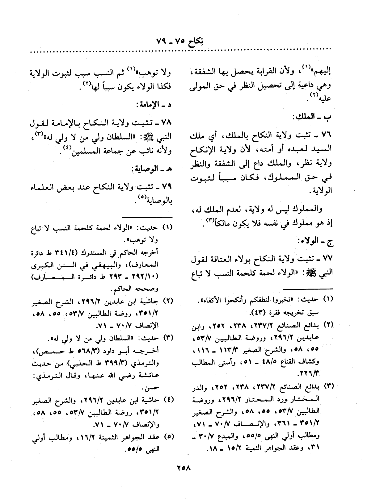77 - تَثْبُتُ وِلاَيَةُ النِّكَاحِ بِوَلاَءِ الْعَتَاقَةِ لِقَوْل النَّبِيِّ صَلَّى اللَّهُ عَلَيْهِ وَسَلَّمَ: " الْوَلاَءُ لُحْمَةٌ كَلُحْمَةِ النَّسَبِ لاَ تُبَاعُ