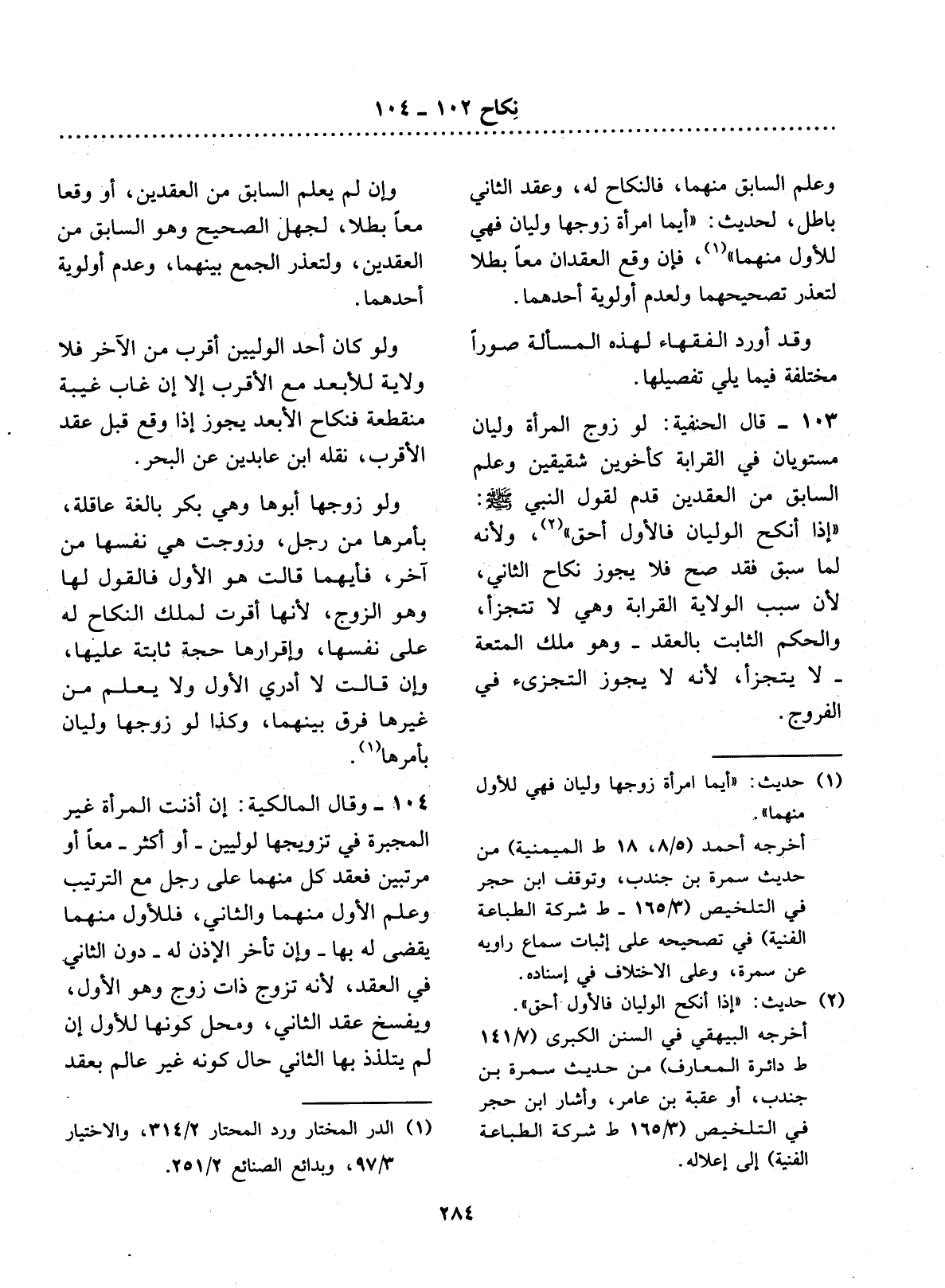 103 - قَال الْحَنَفِيَّةُ: لَوْ زَوَّجَ الْمَرْأَةَ وَلِيَّانِ مُسْتَوِيَانِ فِي الْقَرَابَةِ كَأَخَوَيْنِ شَقِيقَيْنِ وَعُلِمَ السَّابِقُ مِنَ الْعَقْدَيْنِ قُدِّمَ لِقَوْل النَّبِيِّ صَلَّى اللَّهُ عَلَيْهِ وَسَلَّمَ: " إِذَا أَنْكَحَ الْوَلِيَّانِ فَالأَْوَّل أَحَقُّ " (2) ، وَلأَِنَّهُ لَمَّا سَبَقَ فَقَدْ صَحَّ فَلاَ يَجُوزُ نِكَاحُ الثَّانِي، لأَِنَّ سَبَبَ الْوِلاَيَةِ الْقَرَابَةُ وَهِيَ لاَ تَتَجَزَّأُ، وَالْحُكْمُ الثَّابِتُ بِالْعَقْدِ - وَهُوَ مِلْكُ الْمُتْعَةِ - لاَ يَتَجَزَّأُ، لأَِنَّهُ لاَ يَجُوزُ التَّجَزُّئُ فِي الْفُرُوجِ.