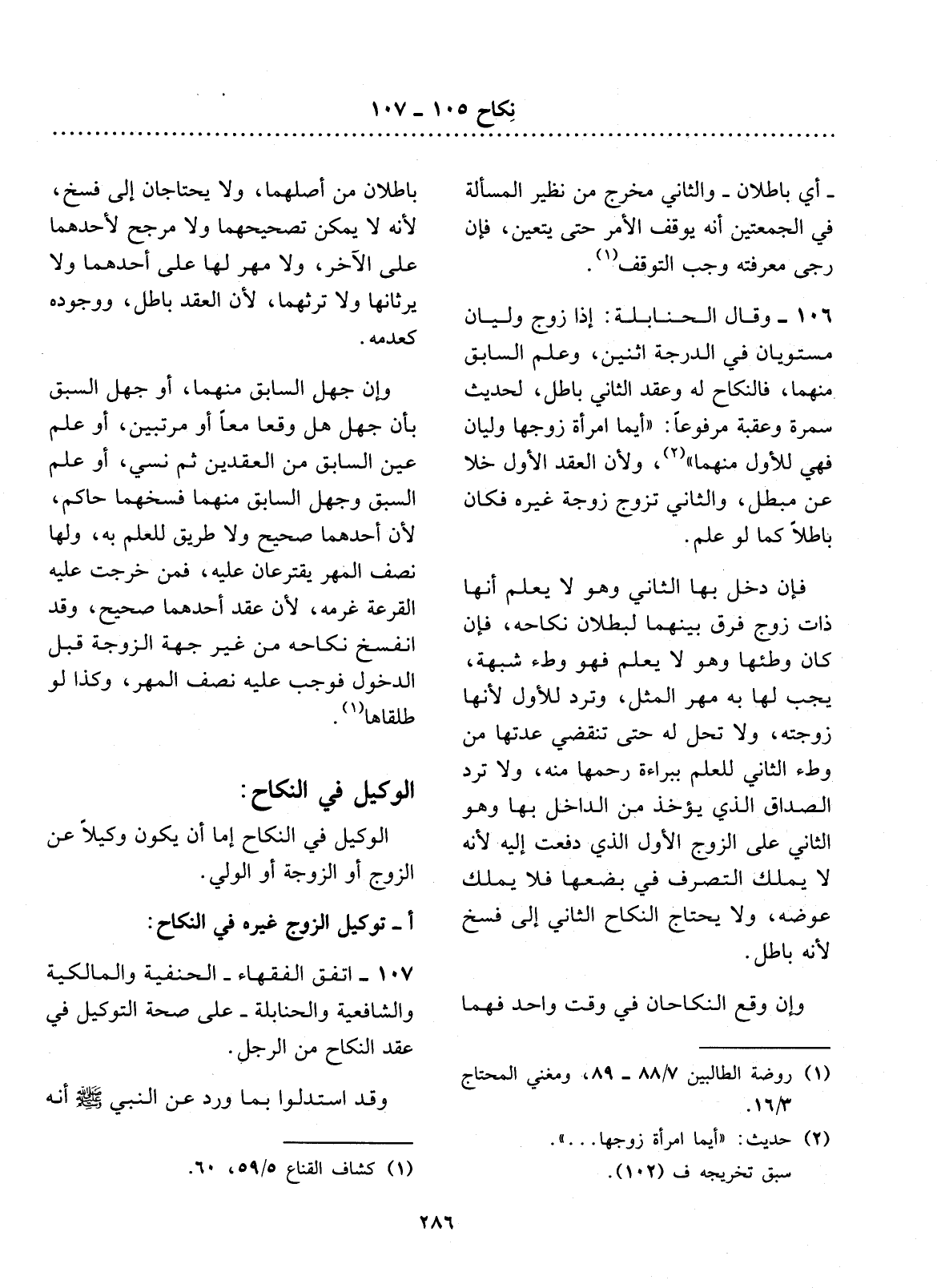 107 - اتَّفَقَ الْفُقَهَاءُ - الْحَنَفِيَّةُ وَالْمَالِكِيَّةُ وَالشَّافِعِيَّةُ وَالْحَنَابِلَةُ - عَلَى صِحَّةِ التَّوْكِيل فِي عَقْدِ النِّكَاحِ مِنَ الرَّجُل.