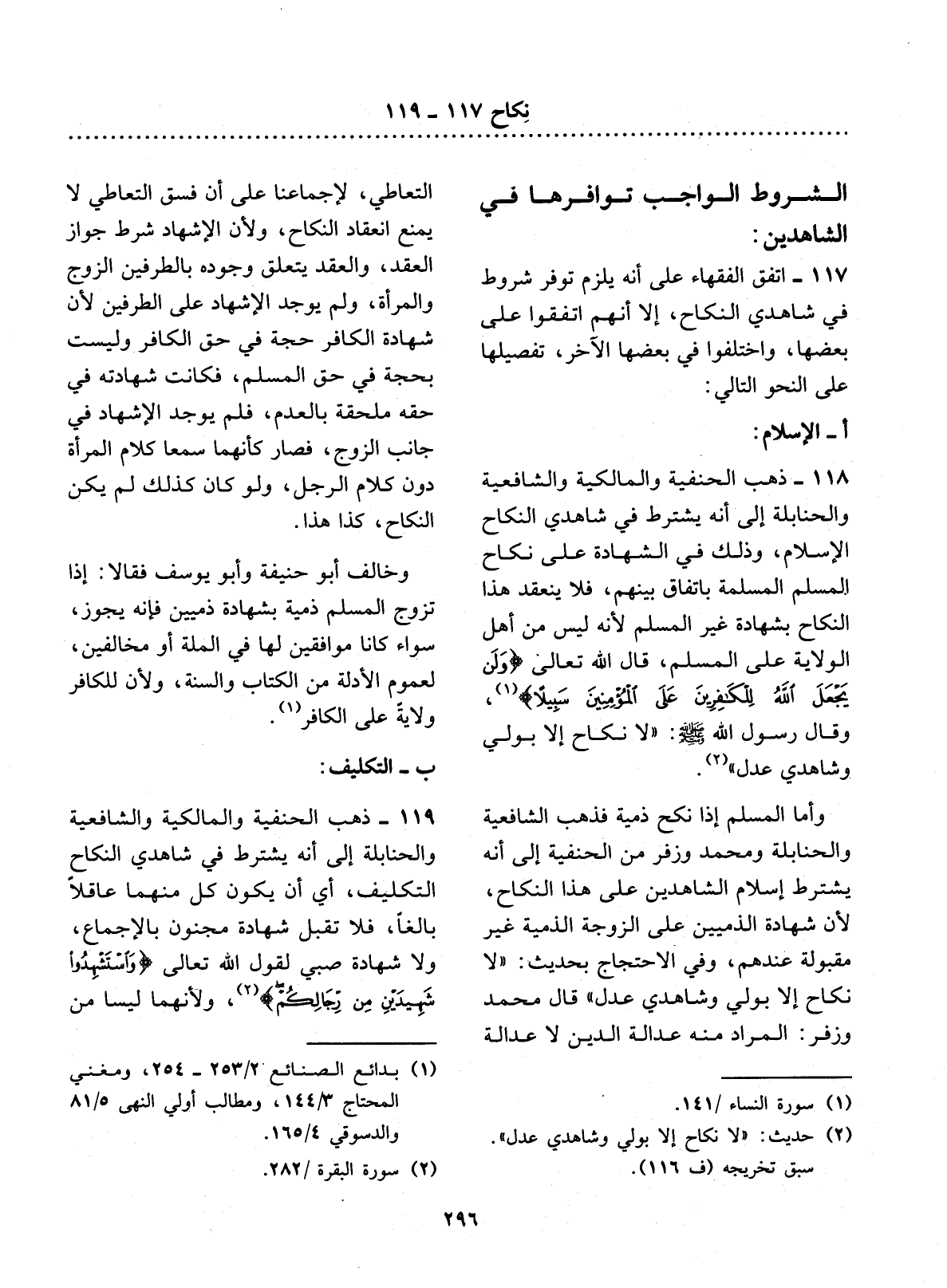 118 - ذَهَبَ الْحَنَفِيَّةُ وَالْمَالِكِيَّةُ وَالشَّافِعِيَّةُ وَالْحَنَابِلَةُ إِلَى أَنَّهُ يُشْتَرَطُ فِي شَاهِدَيِ النِّكَاحِ الإِْسْلاَمُ، وَذَلِكَ فِي الشَّهَادَةِ عَلَى نِكَاحِ الْمُسْلِمِ الْمُسْلِمَةَ بِاتِّفَاقٍ بَيْنَهُمْ، فَلاَ يَنْعَقِدُ هَذَا النِّكَاحُ بِشَهَادَةِ غَيْرِ الْمُسْلِمِ لأَِنَّهُ لَيْسَ مِنْ أَهْل الْوِلاَيَةِ عَلَى الْمُسْلِمِ، قَال اللَّهُ تَعَالَى {وَلَنْ يَجْعَل اللَّهُ لِلْكَافِرِينَ عَلَى الْمُؤْمِنِينَ سَبِيلاً (1) } ، وَقَال رَسُول اللَّهِ صَلَّى اللَّهُ عَلَيْهِ وَسَلَّمَ: " لاَ نِكَاحَ إِلاَّ بِوَلِيٍّ وَشَاهِدَيْ عَدْلٍ " (2) .