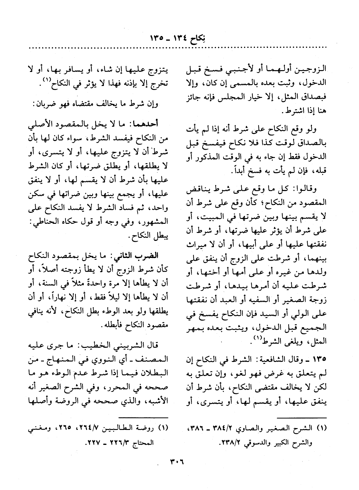 135 - وَقَال الشَّافِعِيَّةُ: الشَّرْطُ فِي النِّكَاحِ إِنْ لَمْ يَتَعَلَّقْ بِهِ غَرَضٌ فَهُوَ لَغْوٌ، وَإِنْ تَعَلَّقَ بِهِ لَكِنْ لاَ يُخَالِفُ مُقْتَضَى النِّكَاحِ، بِأَنْ شَرَطَ أَنْ يُنْفِقَ عَلَيْهَا، أَوْ يَقْسِمَ لَهَا، أَوْ يَتَسَرَّى، أَوْ