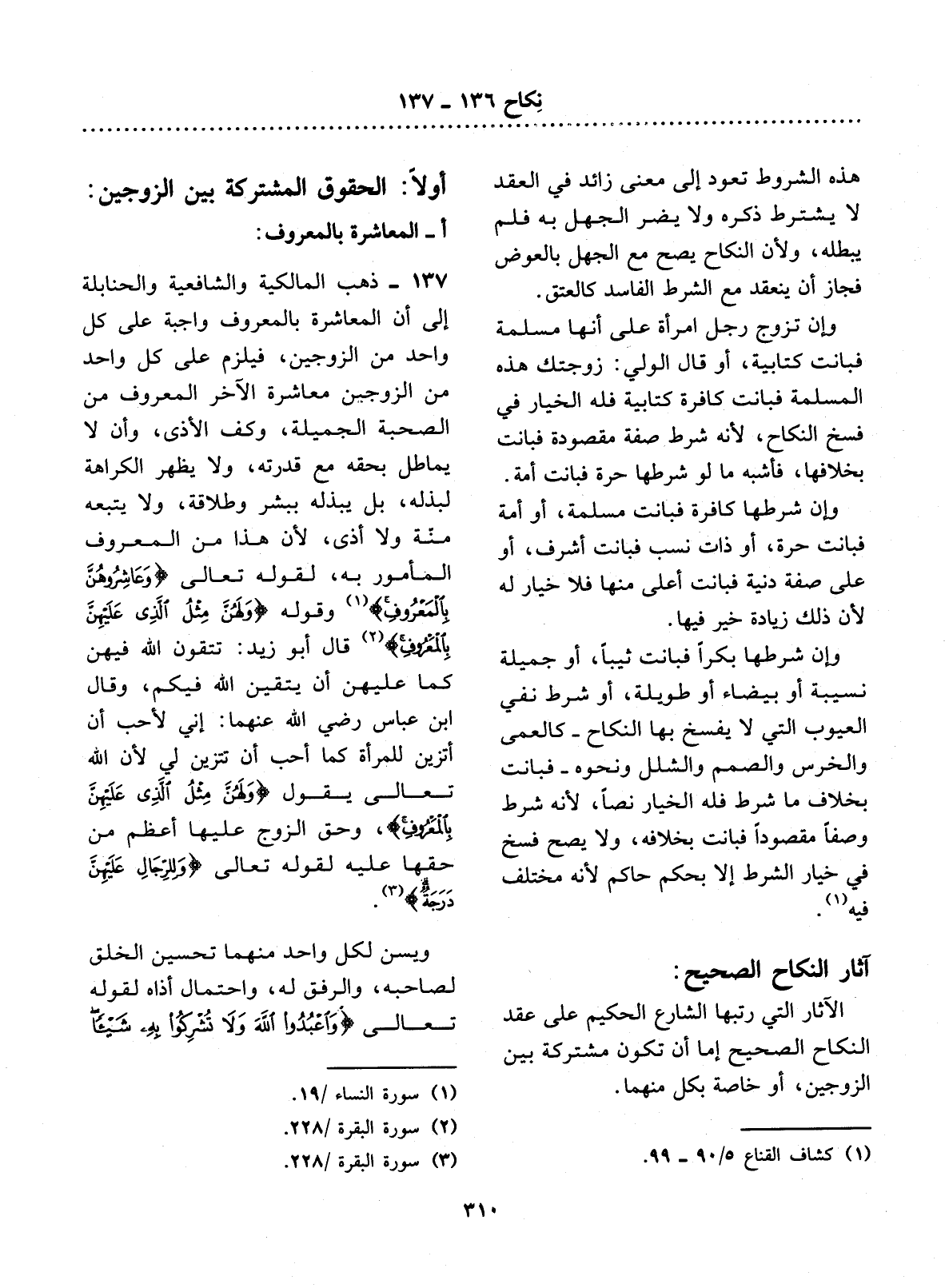 137 - ذَهَبَ الْمَالِكِيَّةُ وَالشَّافِعِيَّةُ وَالْحَنَابِلَةُ إِلَى أَنَّ الْمُعَاشَرَةَ بِالْمَعْرُوفِ وَاجِبَةٌ عَلَى كُل وَاحِدٍ مِنَ الزَّوْجَيْنِ، فَيَلْزَمُ عَلَى كُل وَاحِدٍ مِنَ الزَّوْجَيْنِ مُعَاشَرَةُ الآْخَرِ بِالْمَعْرُوفِ مِنَ الصُّحْبَةِ الْجَمِيلَةِ، وَكَفِّ الأَْذَى، وَأَنْ لاَ يُمَاطِل بِحَقِّهِ مَعَ قُدْرَتِهِ، وَلاَ يُظْهِرَ الْكَرَاهَةَ لِبَذْلِهِ، بَل يَبْذُلُهُ بِبِشْرٍ وَطَلاَقَةٍ، وَلاَ يُتْبِعَهُ مِنَّةً وَلاَ أَذًى، لأَِنَّ هَذَا مِنَ الْمَعْرُوفِ الْمَأْمُورِ بِهِ، لِقَوْلِهِ تَعَالَى {وَعَاشِرُوهُنَّ بِالْمَعْرُوفِ (1) } وَقَوْلِهِ {وَلَهُنَّ مِثْل الَّذِي عَلَيْهِنَّ بِالْمَعْرُوفِ (2) } قَال أَبُو زَيْدٍ: تَتَّقُونَ اللَّهَ فِيهِنَّ كَمَا عَلَيْهِنَّ أَنْ يَتَّقِينَ اللَّهَ فِيكُمْ، وَقَال ابْنُ عَبَّاسٍ رَضِيَ اللَّهُ عَنْهُمَا: إِنِّي لأَُحِبُّ أَنْ أَتَزَيَّنَ لِلْمَرْأَةِ كَمَا أُحِبُّ أَنْ تَتَزَيَّنَ لِي لأَِنَّ اللَّهَ تَعَالَى يَقُول {وَلَهُنَّ مِثْل الَّذِي عَلَيْهِنَّ بِالْمَعْرُوفِ} ، وَحَقُّ الزَّوْجِ عَلَيْهَا أَعْظَمُ مِنْ حَقِّهَا عَلَيْهِ لِقَوْلِهِ تَعَالَى {وَلِلرِّجَال عَلَيْهِنَّ دَرَجَةٌ (3) } .