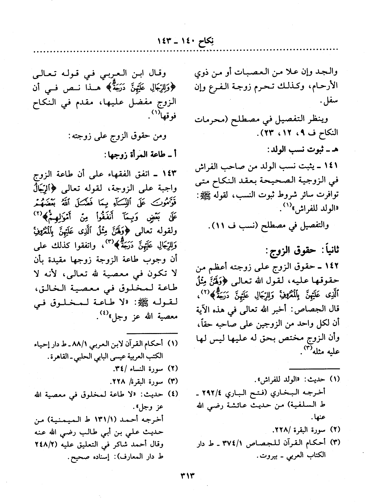 142 - حُقُوقُ الزَّوْجِ عَلَى زَوْجَتِهِ أَعْظَمُ مِنْ حُقُوقِهَا عَلَيْهِ، لِقَوْل اللَّهِ تَعَالَى {وَلَهُنَّ مِثْل الَّذِي عَلَيْهِنَّ بِالْمَعْرُوفِ وَلِلرِّجَال عَلَيْهِنَّ دَرَجَةٌ (2) } ، قَال الْجَصَّاصُ: أَخْبَرَ اللَّهُ تَعَالَى فِي هَذِهِ الآْيَةِ أَنَّ لِكُل وَاحِدٍ مِنَ الزَّوْجَيْنِ عَلَى صَاحِبِهِ حَقًّا، وَأَنَّ الزَّوْجَ مُخْتَصٌّ بِحَقٍّ لَهُ عَلَيْهَا لَيْسَ لَهَا عَلَيْهِ مِثْلُهُ (3) .