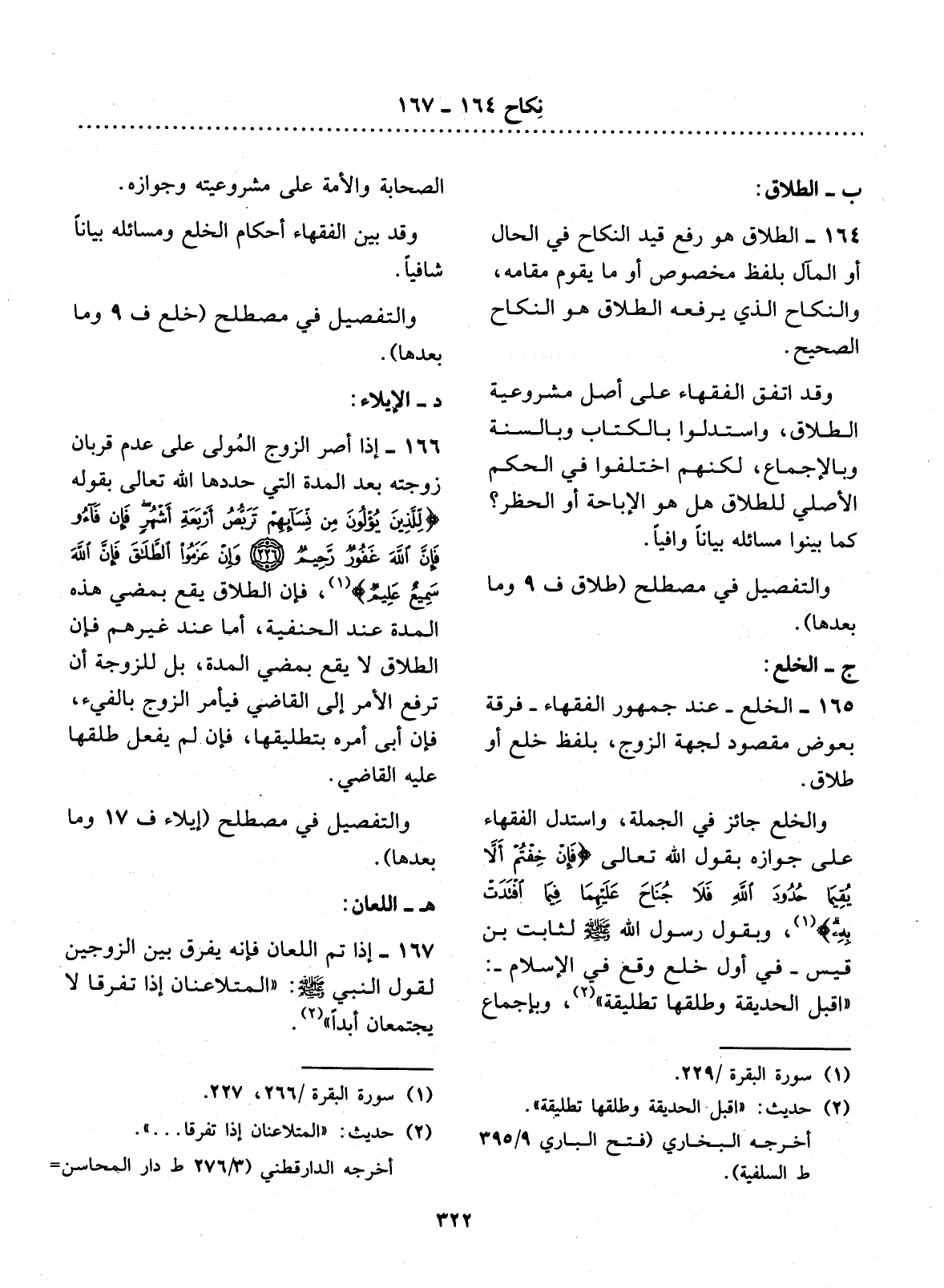 164 - الطَّلاَقُ هُوَ رَفْعُ قَيْدِ النِّكَاحِ فِي الْحَال أَوِ الْمَآل بِلَفْظٍ مَخْصُوصٍ أَوْ مَا يَقُومُ مَقَامَهُ، وَالنِّكَاحُ الَّذِي يَرْفَعُهُ الطَّلاَقُ هُوَ النِّكَاحُ الصَّحِيحُ.