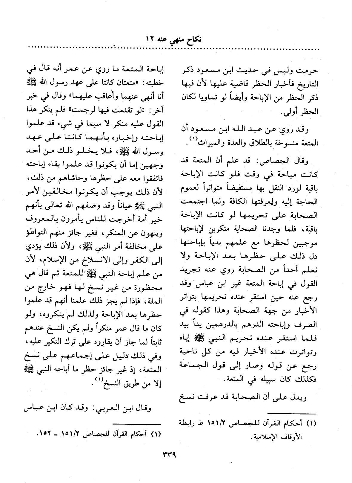 وَقَدْ رُوِيَ عَنْ عَبْدِ اللَّهِ بْنِ مَسْعُودٍ أَنَّ الْمُتْعَةَ مَنْسُوخَةٌ بِالطَّلاَقِ وَالْعِدَّةِ وَالْمِيرَاثِ (1) وَقَال الْجَصَّاصُ: قَدْ عُلِمَ أَنَّ الْمُتْعَةَ قَدْ كَانَتْ مُبَاحَةً فِي وَقْتٍ فَلَوْ كَانَتِ الإِْبَاحَةُ بَاقِيَةً لَوَرَدَ النَّقْل بِهَا مُسْتَفِيضًا مُتَوَاتِرًا لِعُمُومِ الْحَاجَةِ إِلَيْهِ وَلَعَرَّفَتْهَا الْكَافَّةُ وَلَمَا اجْتَمَعَتِ الصَّحَابَةُ عَلَى تَحْرِيمِهَا لَوْ كَانَتِ الإِْبَاحَةُ بَاقِيَةً، فَلَمَّا وَجَدْنَا الصَّحَابَةَ مُنْكِرِينَ لإِِبَاحَتِهَا مُوجِبِينَ لِحَظْرِهَا مَعَ عِلْمِهِمْ بَدْيًا بِإِبَاحَتِهَا دَل ذَلِكَ عَلَى حَظْرِهَا بَعْدَ الإِْبَاحَةِ وَلاَ نَعْلَمُ أَحَدًا مِنَ الصَّحَابَةِ رُوِيَ عَنْهُ تَجْرِيدُ الْقَوْل فِي إِبَاحَةِ الْمُتْعَةِ غَيْرَ ابْنِ عَبَّاسٍ وَقَدْ رَجَعَ عَنْهُ حِينَ اسْتَقَرَّ عِنْدَهُ تَحْرِيمُهَا بِتَوَاتُرِ الأَْخْبَارِ مِنْ جِهَةِ الصَّحَابَةِ وَهَذَا كَقَوْلِهِ فِي الصَّرْفِ وَإِبَاحَتِهِ الدِّرْهَمَ بِالدِّرْهَمَيْنِ يَدًا بِيَدٍ فَلَمَّا اسْتَقَرَّ عِنْدَهُ تَحْرِيمُ النَّبِيِّ صَلَّى اللَّهُ عَلَيْهِ وَسَلَّمَ إِيَّاهُ وَتَوَاتَرَتْ عِنْدَهُ الأَْخْبَارُ فِيهِ مِنْ كُل نَاحِيَةٍ رَجَعَ عَنْ قَوْلِهِ وَصَارَ إِلَى قَوْل الْجَمَاعَةِ فَكَذَلِكَ كَانَ سَبِيلُهُ فِي الْمُتْعَةِ.