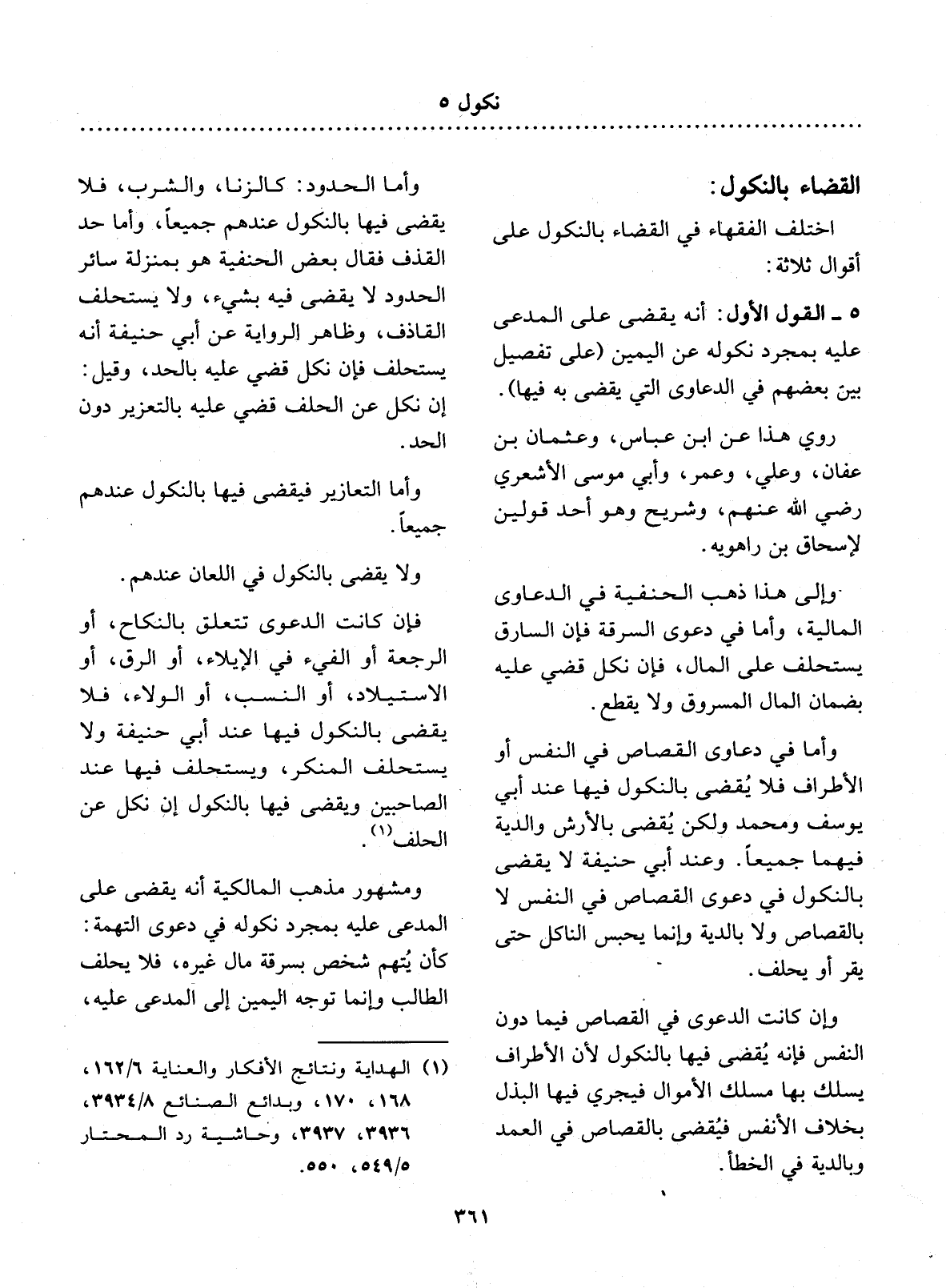 5 - الْقَوْل الأَْوَّل: أَنَّهُ يُقْضَى عَلَى الْمُدَّعَى عَلَيْهِ بِمُجَرَّدِ نُكُولِهِ عَنِ الْيَمِينِ (عَلَى تَفْصِيلٍ بَيْنَ بَعْضِهِمْ فِي الدَّعَاوَى الَّتِي يُقْضَى بِهِ فِيهَا) . رُوِيَ هَذَا عَنِ ابْنِ عَبَّاسٍ، وَعُثْمَانَ بْنِ عَفَّانَ، وَعَلِيٍّ، وَعُمَرَ، وَأَبِي مُوسَى الأَْشْعَرِيِّ رَضِيَ اللَّهُ عَنْهُمْ، وَشُرَيْحٍ وَهُوَ أَحَدُ قَوْلَيْنِ لإِِسْحَاقَ بْنِ رَاهَوَيْهِ. وَإِلَى هَذَا ذَهَبَ الْحَنَفِيَّةُ فِي الدَّعَاوَى الْمَالِيَّةِ، وَأَمَّا فِي دَعْوَى السَّرِقَةِ فَإِنَّ السَّارِقَ يُسْتَحْلَفُ عَلَى الْمَال، فَإِنْ نَكَل قُضِيَ عَلَيْهِ بِضَمَانِ الْمَال الْمَسْرُوقِ وَلاَ يُقْطَعُ.