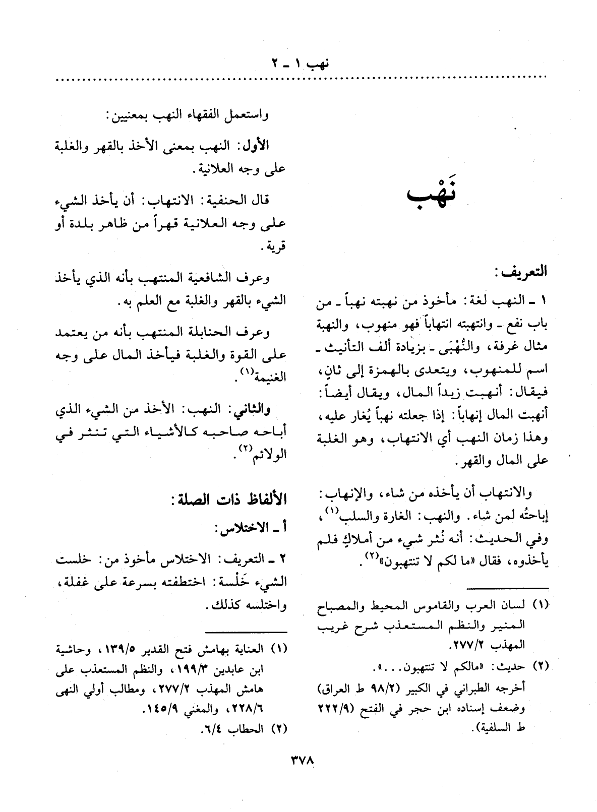 1 - النَّهْبُ لُغَةً: مَأْخُوذٌ مِنْ نَهَبْتُهُ - مِنْ بَابِ نَفْعٍ - وَانْتَهَبْتُهُ انْتِهَابًا فَهُوَ مَنْهُوبٌ، وَالنُّهْبَةُ مِثَال غُرْفَةٍ، وَالنُّهْبَى - بِزِيَادَةِ أَلِفِ التَّأْنِيثِ - اسْمٌ لِلْمَنْهُوبِ، وَيَتَعَدَّى بِالْهَمْزَةِ إِلَى ثَانٍ، فَيُقَال: أَنْهَبْتُ زَيْدًا الْمَال، وَيُقَال أَيْضًا: أَنْهَبْتُ الْمَال إِنْهَابًا: إِذَا جَعَلْتَهُ نَهْبًا يُغَارُ عَلَيْهَا، وَهَذَا زَمَانُ النَّهْبِ أَيِ الاِنْتِهَابِ، وَهُوَ الْغَلَبَةُ عَلَى الْمَال وَالْقَهْرُ.