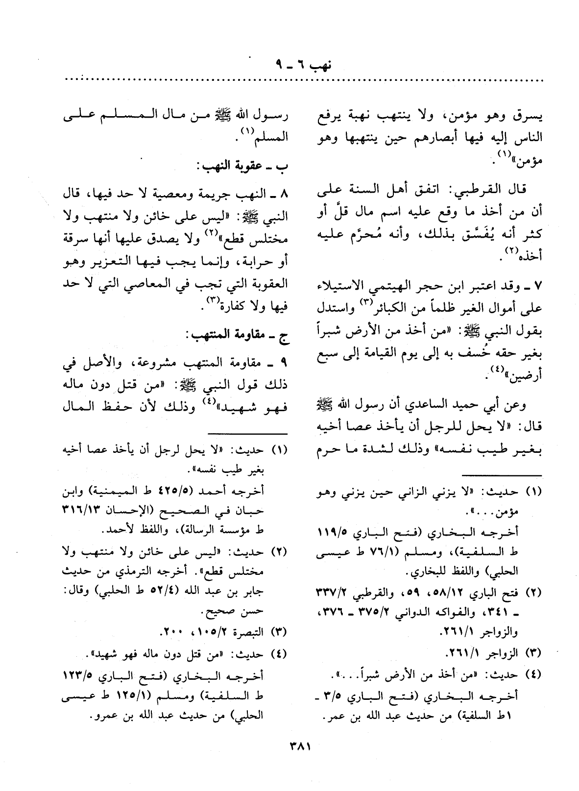 9 - مُقَاوَمَةُ الْمُنْتَهِبِ مَشْرُوعَةٌ، وَالأَْصْل فِي ذَلِكَ قَوْل النَّبِيِّ - صَلَّى اللَّهُ عَلَيْهِ وَسَلَّمَ -: مَنْ قُتِل دُونَ مَالِهِ فَهُوَ شَهِيدٌ (4) وَذَلِكَ لأَِنَّ حِفْظَ الْمَال