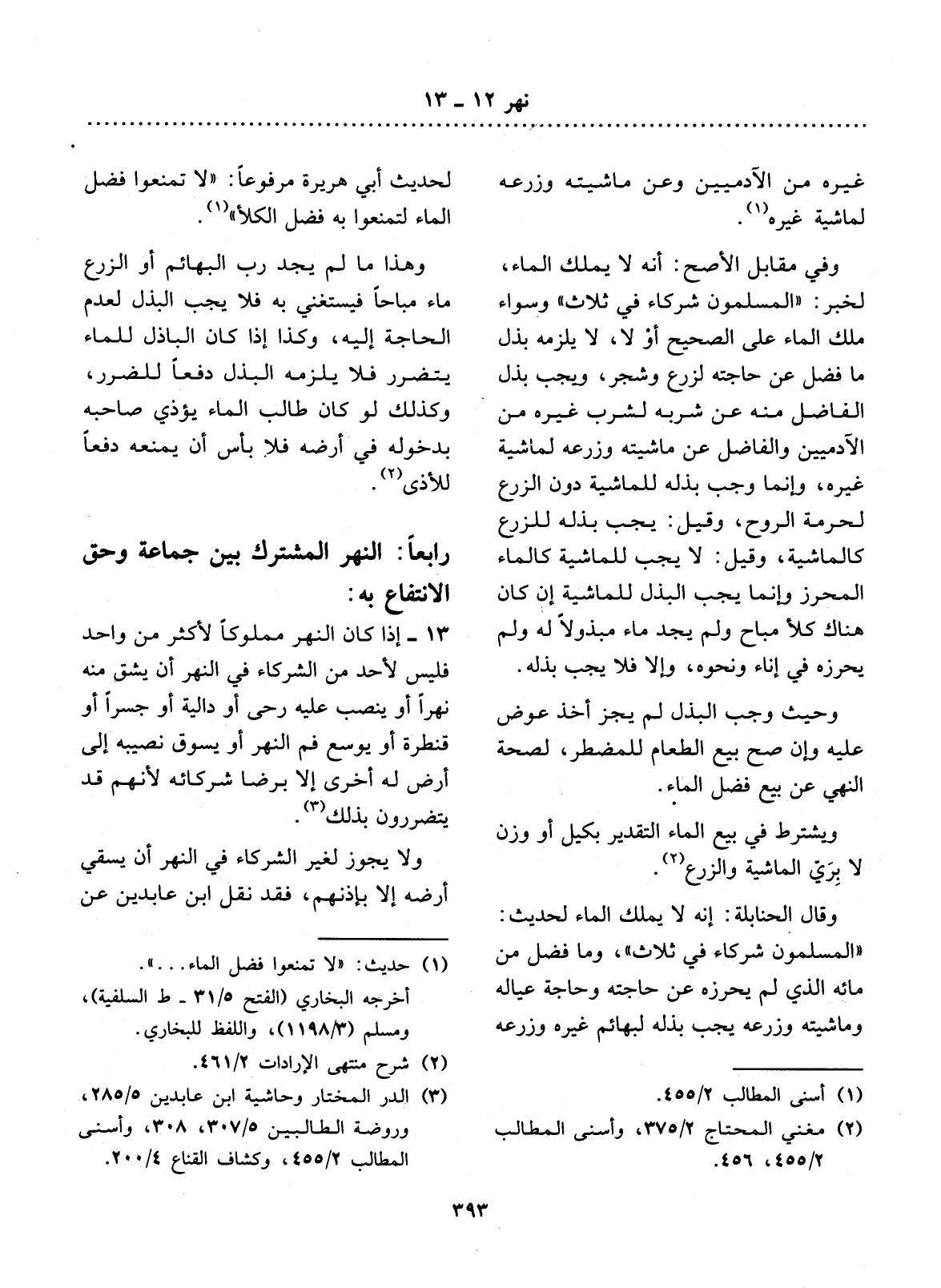 13 - إِذَا كَانَ النَّهْرُ مَمْلُوكًا لأَِكْثَرَ مِنْ وَاحِدٍ فَلَيْسَ لأَِحَدٍ مِنَ الشُّرَكَاءِ فِي النَّهْرِ أَنْ يَشُقَّ مِنْهُ نَهْرًا أَوْ يَنْصِبَ عَلَيْهِ رَحًى أَوْ دَالِيَةً أَوْ جِسْرًا أَوْ قَنْطَرَةً أَوْ يُوَسِّعَ فَمَ النَّهْرِ أَوْ يَسُوقَ نَصِيبَهُ إِلَى أَرْضٍ لَهُ أُخْرَى إِلاَّ بِرِضَا شُرَكَائِهِ لأَِنَّهُمْ قَدْ يَتَضَرَّرُونَ بِذَلِكَ (3) .