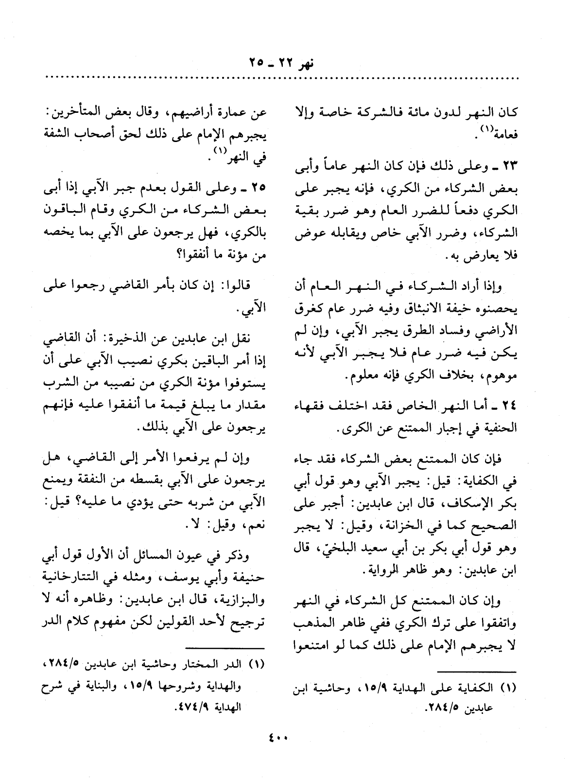 23 - وَعَلَى ذَلِكَ فَإِنْ كَانَ النَّهْرُ عَامًّا وَأَبَى بَعْضُ الشُّرَكَاءِ مِنَ الْكَرْيِ، فَإِنَّهُ يُجْبَرُ عَلَى الْكَرْيِ دَفْعًا لِلضَّرَرِ الْعَامِّ وَهُوَ ضَرَرُ بَقِيَّةِ الشُّرَكَاءِ، وَضَرَرُ الآْبِي خَاصٌّ وَيُقَابِلُهُ عِوَضٌ فَلاَ يُعَارَضُ بِهِ.