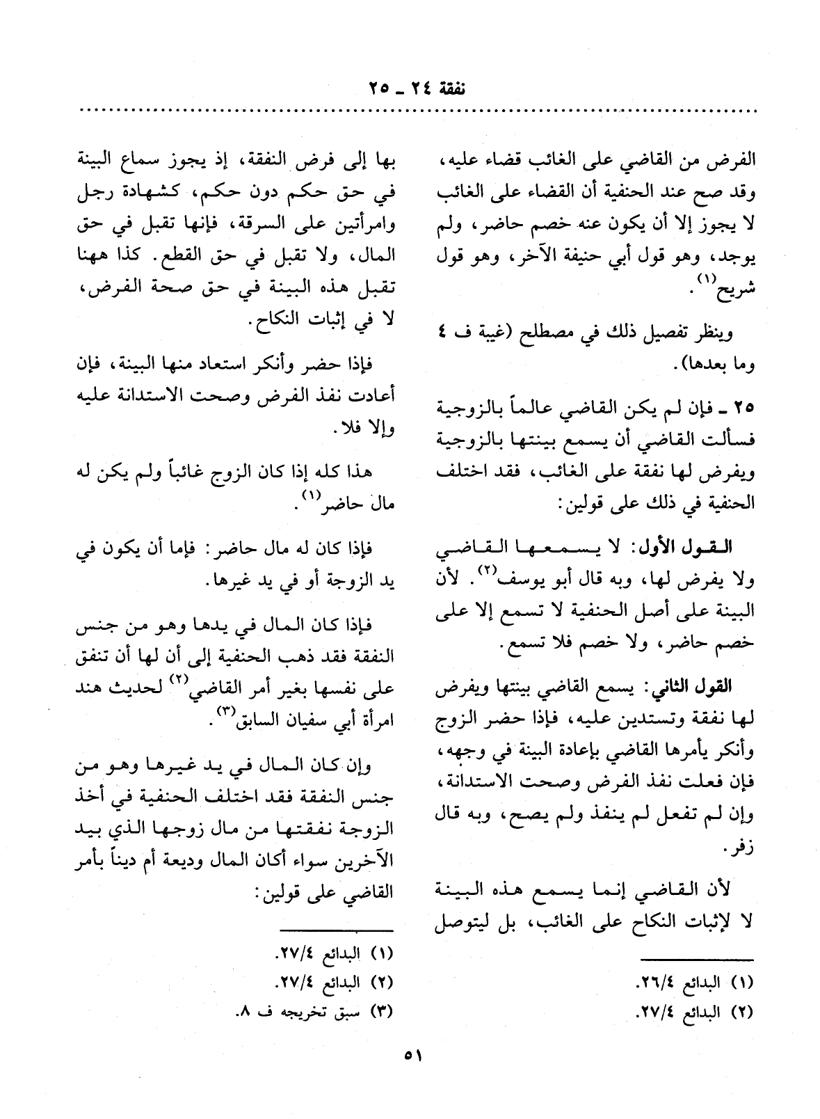 25 - فَإِنْ لَمْ يَكُنِ الْقَاضِي عَالِمًا بِالزَّوْجِيَّةِ فَسَأَلَتِ الْقَاضِيَ أَنْ يَسْمَعَ بَيِّنَتَهَا بِالزَّوْجِيَّةِ وَيَفْرِضَ لَهَا نَفَقَةً عَلَى الْغَائِبِ، فَقَدِ اخْتَلَفَ الْحَنَفِيَّةُ فِي ذَلِكَ عَلَى قَوْلَيْنِ: