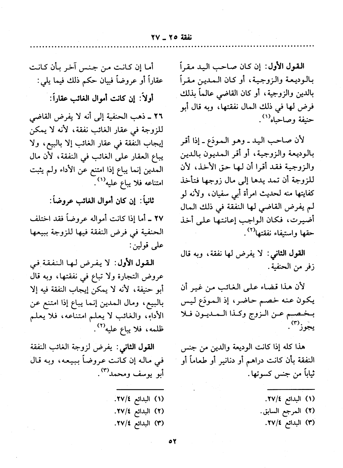 27 - أَمَّا إِذَا كَانَتْ أَمْوَالُهُ عُرُوضًا فَقَدِ اخْتَلَفَ الْحَنَفِيَّةُ فِي فَرْضِ النَّفَقَةِ فِيهَا لِلزَّوْجَةِ بِبَيْعِهَا عَلَى قَوْلَيْنِ:
