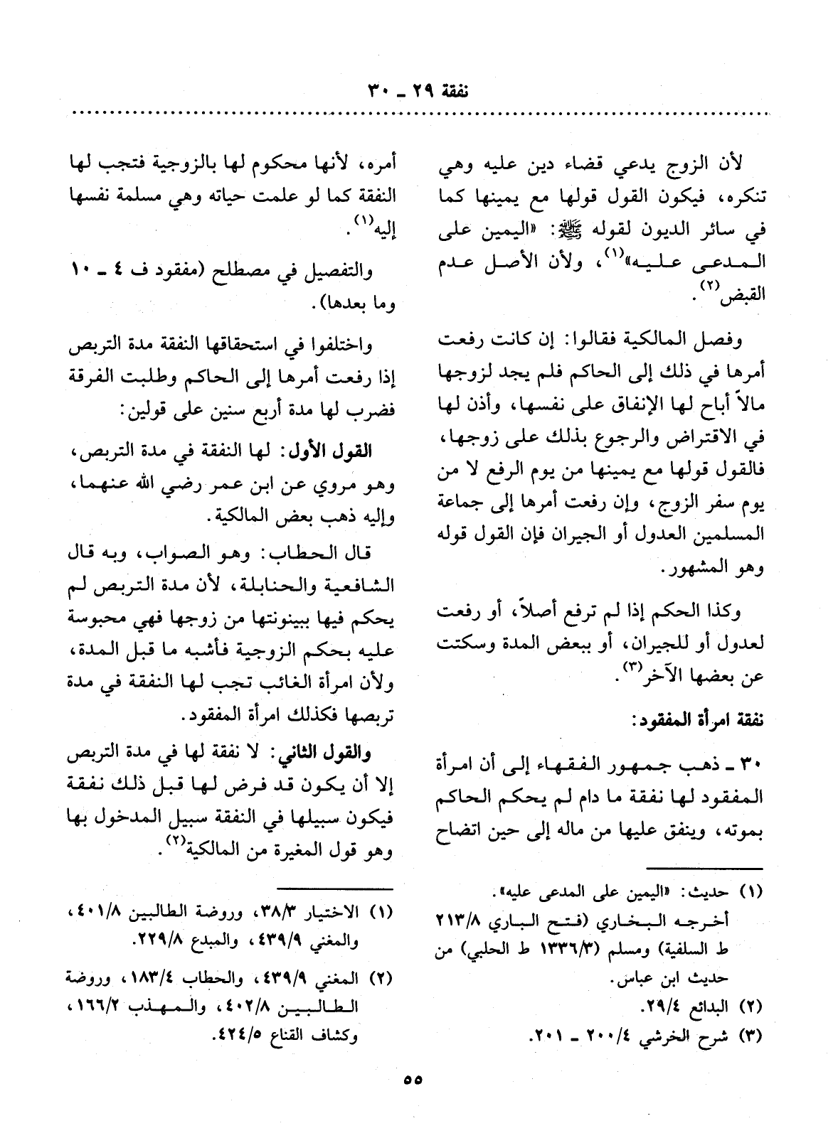 30 - ذَهَبَ جُمْهُورُ الْفُقَهَاءِ إِلَى أَنَّ امْرَأَةَ الْمَفْقُودِ لَهَا نَفَقَةٌ مَا دَامَ لَمْ يَحْكُمِ الْحَاكِمُ بِمَوْتِهِ، وَيُنْفَقُ عَلَيْهَا مِنْ مَالِهِ إِلَى حِينِ اتِّضَاحِ