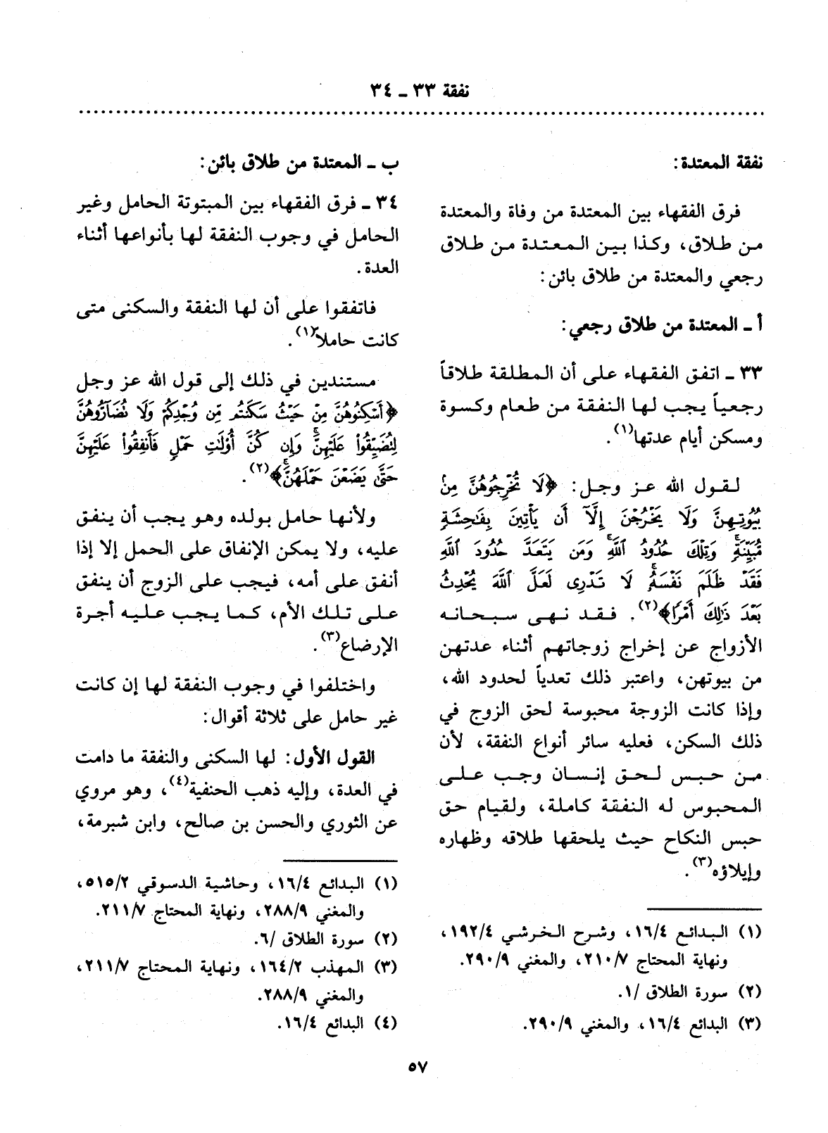 34 - فَرَّقَ الْفُقَهَاءُ بَيْنَ الْمَبْتُوتَةِ الْحَامِل وَغَيْرِ الْحَامِل فِي وُجُوبِ النَّفَقَةِ لَهَا بِأَنْوَاعِهَا أَثْنَاءَ الْعِدَّةِ.