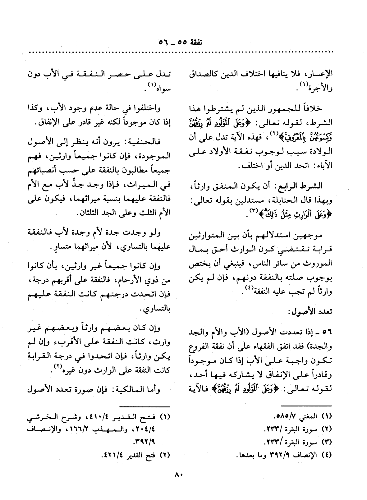 56 - إِذَا تَعَدَّدَتِ الأُْصُول (الأَْبُ وَالأُْمُّ وَالْجَدُّ وَالْجَدَّةُ) فَقَدِ اتَّفَقَ الْفُقَهَاءُ عَلَى أَنَّ نَفَقَةَ الْفُرُوعِ تَكُونُ وَاجِبَةً عَلَى الأَْبِ إِذَا كَانَ مَوْجُودًا وَقَادِرًا عَلَى الإِْنْفَاقِ لاَ يُشَارِكُهُ فِيهَا أَحَدٌ، لِقَوْلِهِ تَعَالَى: {وَعَلَى الْمَوْلُودِ لَهُ رِزْقُهُنَّ (5) } ، فَالآْيَةُ