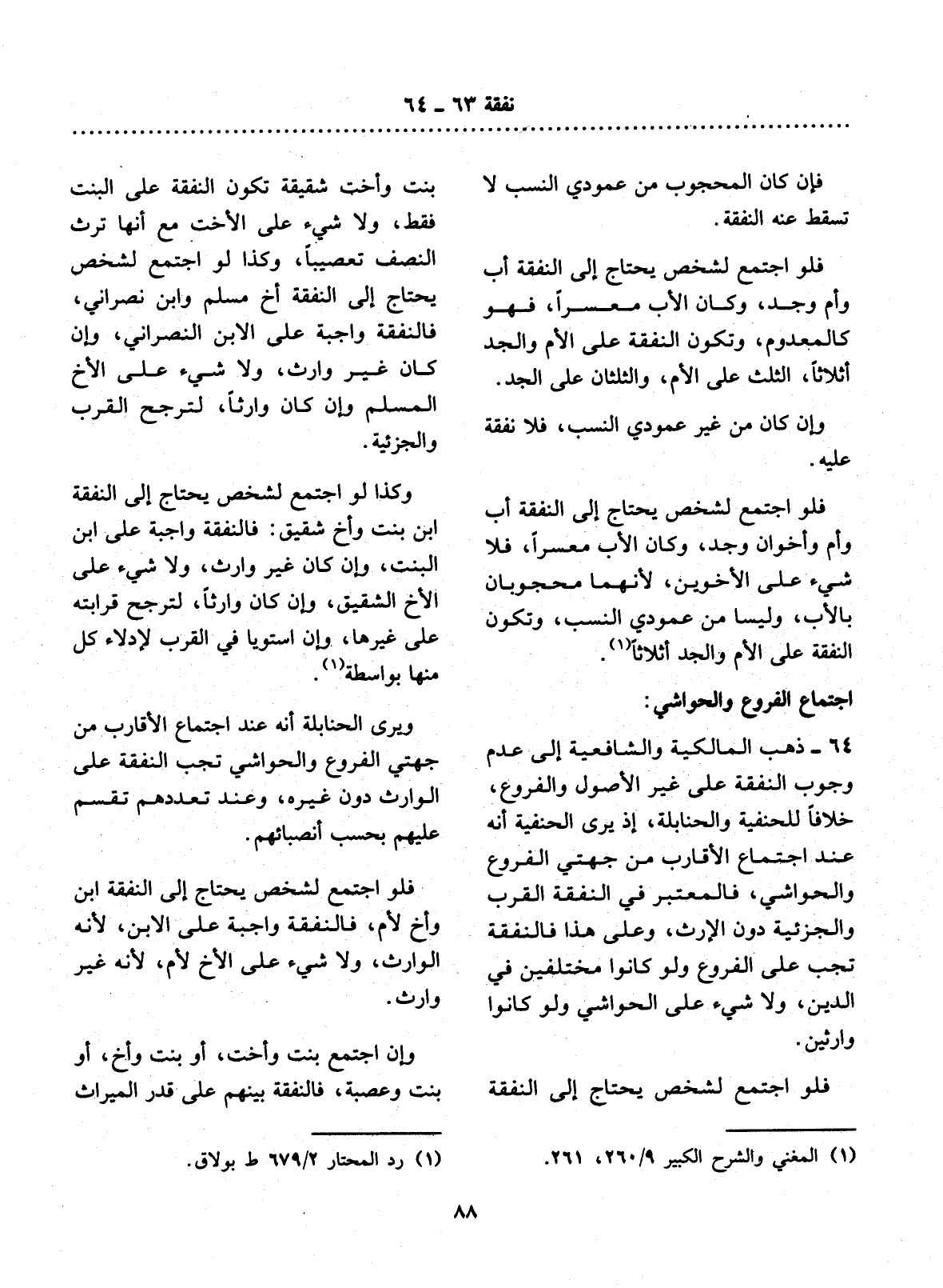 64 - ذَهَبَ الْمَالِكِيَّةُ وَالشَّافِعِيَّةُ إِلَى عَدَمِ وُجُوبِ النَّفَقَةِ عَلَى غَيْرِ الأُْصُول وَالْفُرُوعِ، خِلاَفًا لِلْحَنَفِيَّةِ وَالْحَنَابِلَةِ، إِذْ يَرَى الْحَنَفِيَّةُ أَنَّهُ عِنْدَ اجْتِمَاعِ الأَْقَارِبِ مِنْ جِهَتَيِ الْفُرُوعِ وَالْحَوَاشِي، فَالْمُعْتَبَرُ فِي النَّفَقَةِ الْقُرْبُ وَالْجُزْئِيَّةُ دُونَ الإِْرْثِ، وَعَلَى هَذَا فَالنَّفَقَةُ تَجِبُ عَلَى الْفُرُوعِ وَلَوْ كَانُوا مُخْتَلِفِينَ فِي الدِّينِ، وَلاَ شَيْءَ عَلَى الْحَوَاشِي وَلَوْ كَانُوا وَارِثِينَ.