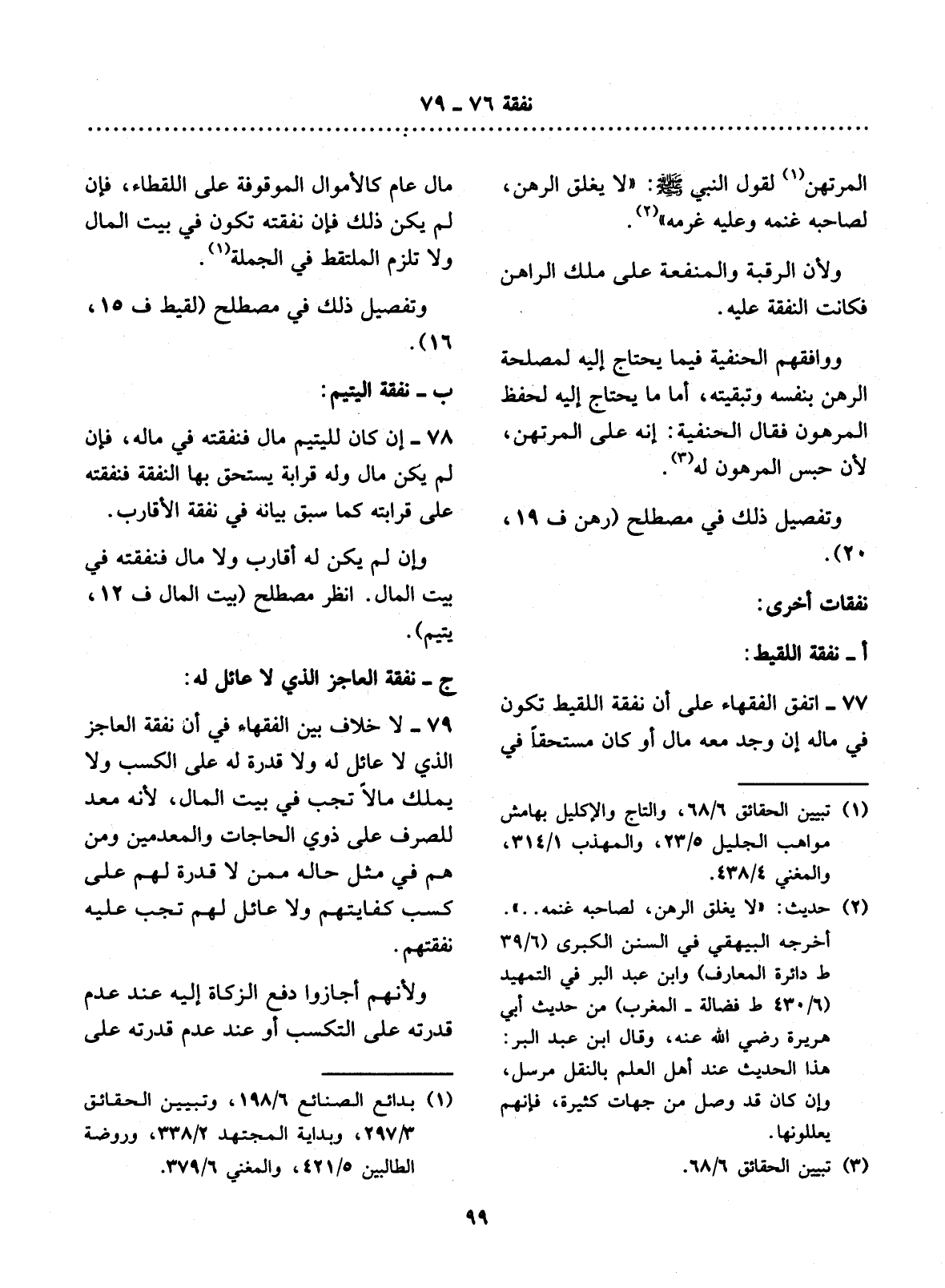 77 - اتَّفَقَ الْفُقَهَاءُ عَلَى أَنَّ نَفَقَةَ اللَّقِيطِ تَكُونُ فِي مَالِهِ إِنْ وُجِدَ مَعَهُ مَالٌ أَوْ كَانَ مُسْتَحِقًّا فِي