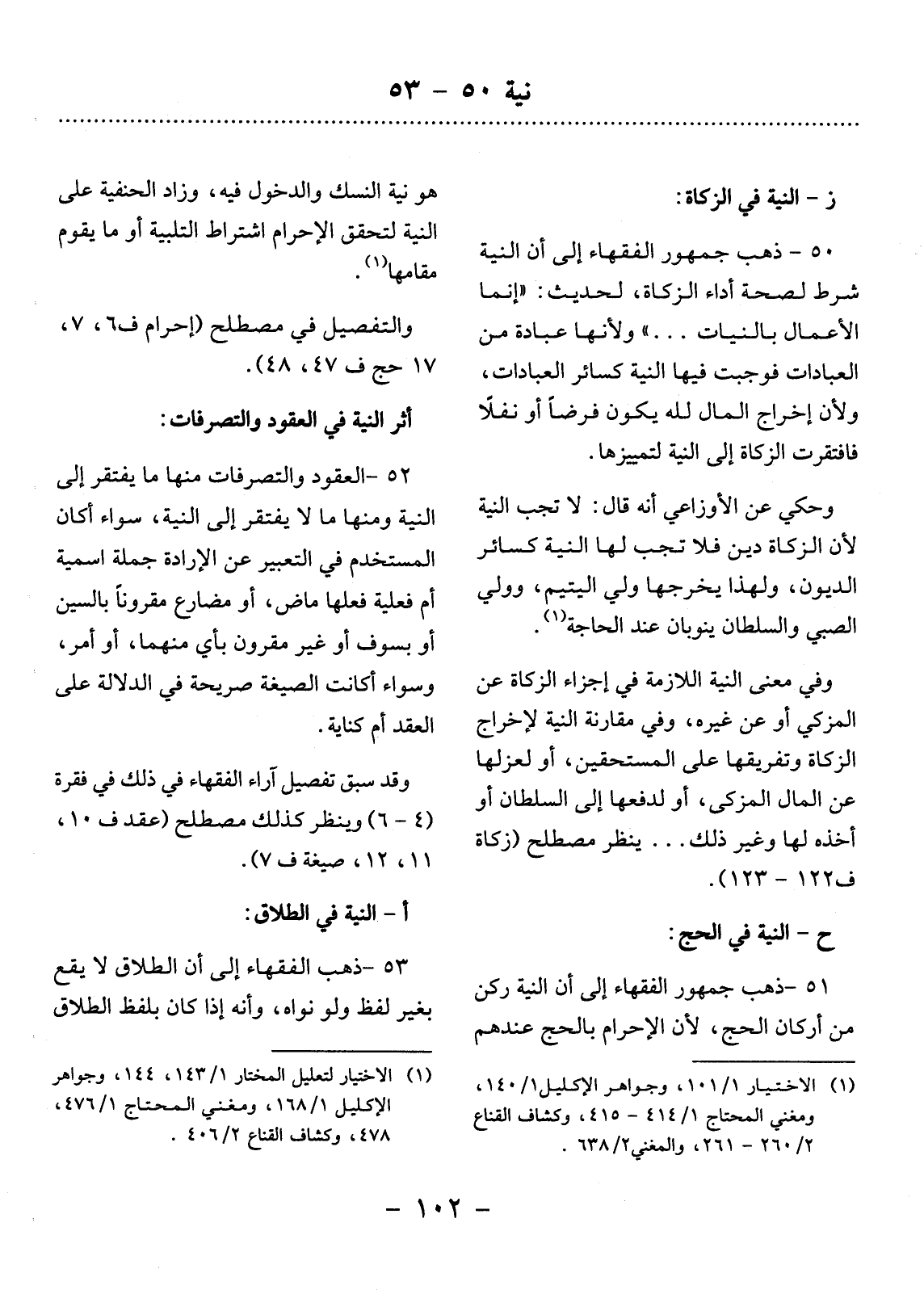 52 - الْعُقُودُ وَالتَّصَرُّفَاتُ مِنْهَا مَا يَفْتَقِرُ إِلَى النِّيَّةِ وَمِنْهَا مَا لاَ يَفْتَقِرُ إِلَى النِّيَّةِ، سَوَاءٌ أَكَانَ الْمُسْتَخْدَمُ فِي التَّعْبِيرِ عَنِ الإِْرَادَةِ جُمْلَةً اسْمِيَّةً أَمْ فِعْلِيَّةً فِعْلُهَا مَاضٍ، أَوْ مُضَارِعٌ مَقْرُونًا بِالسِّينِ أَوْ بِسَوْفَ أَوْ غَيْرَ مَقْرُونٍ بِأَيٍّ مِنْهُمَا، أَوْ أَمْرٌ، وَسَوَاءٌ أَكَانَتِ الصِّيغَةُ صَرِيحَةً فِي الدَّلاَلَةِ عَلَى الْعَقْدِ أَمْ كِنَايَةً.