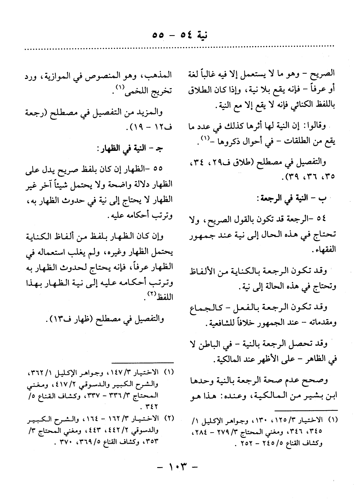 55 - الظِّهَارُ إِنْ كَانَ بِلَفْظٍ صَرِيحٍ يَدُل عَلَى الظِّهَارِ دَلاَلَةً وَاضِحَةً وَلاَ يَحْتَمِل شَيْئًا آخَرَ غَيْرَ الظِّهَارِ لاَ يَحْتَاجُ إِلَى نِيَّةٍ فِي حُدُوثِ الظِّهَارِ بِهِ، وَتَرَتُّبِ أَحْكَامِهِ عَلَيْهِ.