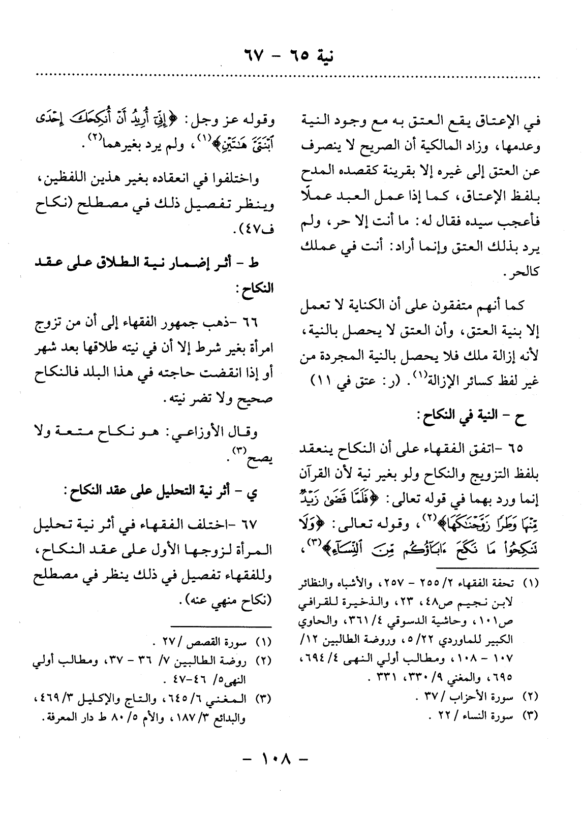 65 - اتَّفَقَ الْفُقَهَاءُ عَلَى أَنَّ النِّكَاحَ يَنْعَقِدُ بِلَفْظِ التَّزْوِيجِ وَالنِّكَاحِ وَلَوْ بِغَيْرِ نِيَّةٍ لأَِنَّ الْقُرْآنَ إِنَّمَا وَرَدَ بِهِمَا فِي قَوْلِهِ تَعَالَى: {فَلَمَّا قَضَى زَيْدٌ مِنْهَا وَطَرًا زَوَّجْنَاكَهَا (2) } ، وَقَوْلِهِ تَعَالَى: {وَلاَ تَنْكِحُوا مَا نَكَحَ آبَاؤُكُمْ مِنَ النِّسَاءِ (3) }