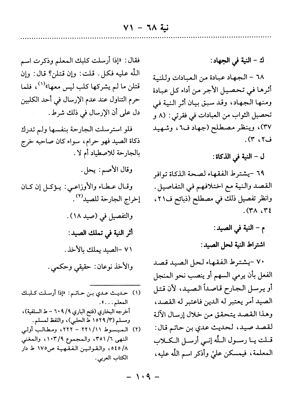 (1) حديث عدي بن حاتم: " إذا أرسلت كلبك المعلم. . . ". أخرجه البخاري (فتح الباري 9 / 609 - ط السلفية) ، ومسلم (3 / 1529 ط الحلبي) ، واللفظ لمسلم.