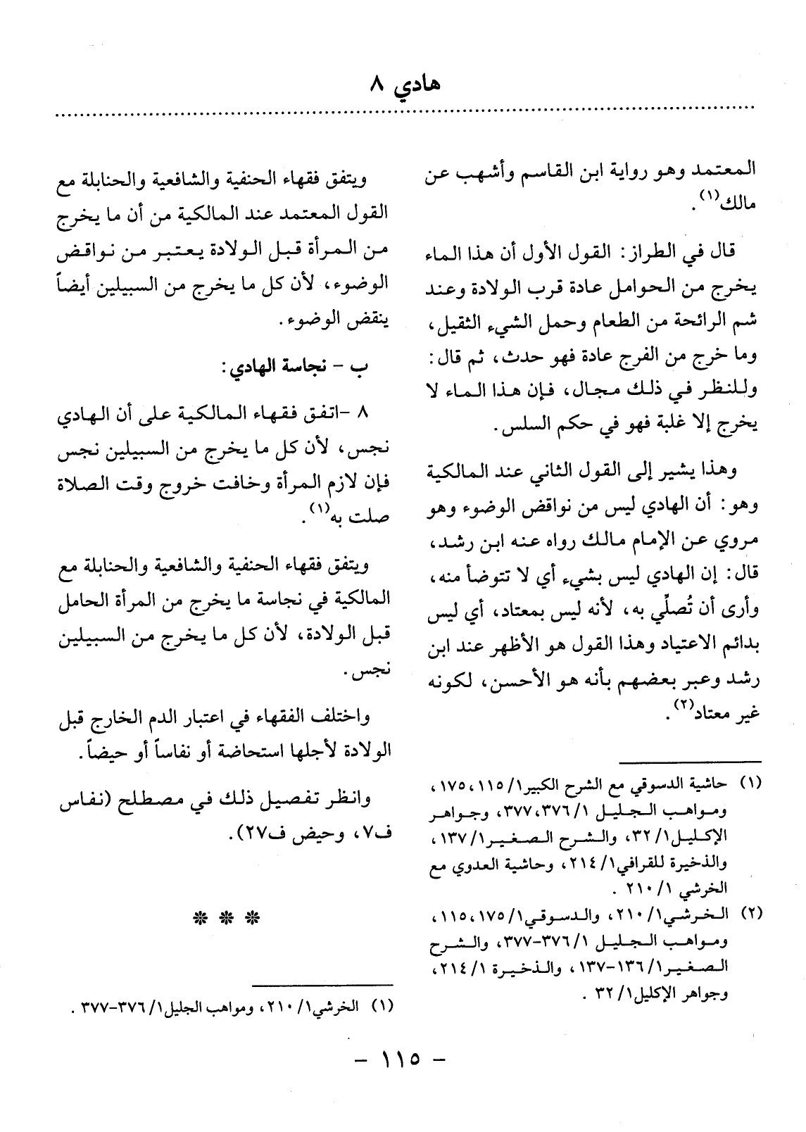 (2) الخرشي 1 / 210، والدسوقي 1 / 175، 115، ومواهب الجليل 1 / 376 - 377، والشرح الصغير 1 / 136 - 137، والذخيرة 1 / 214، وجواهر الإكليل 1 / 32.