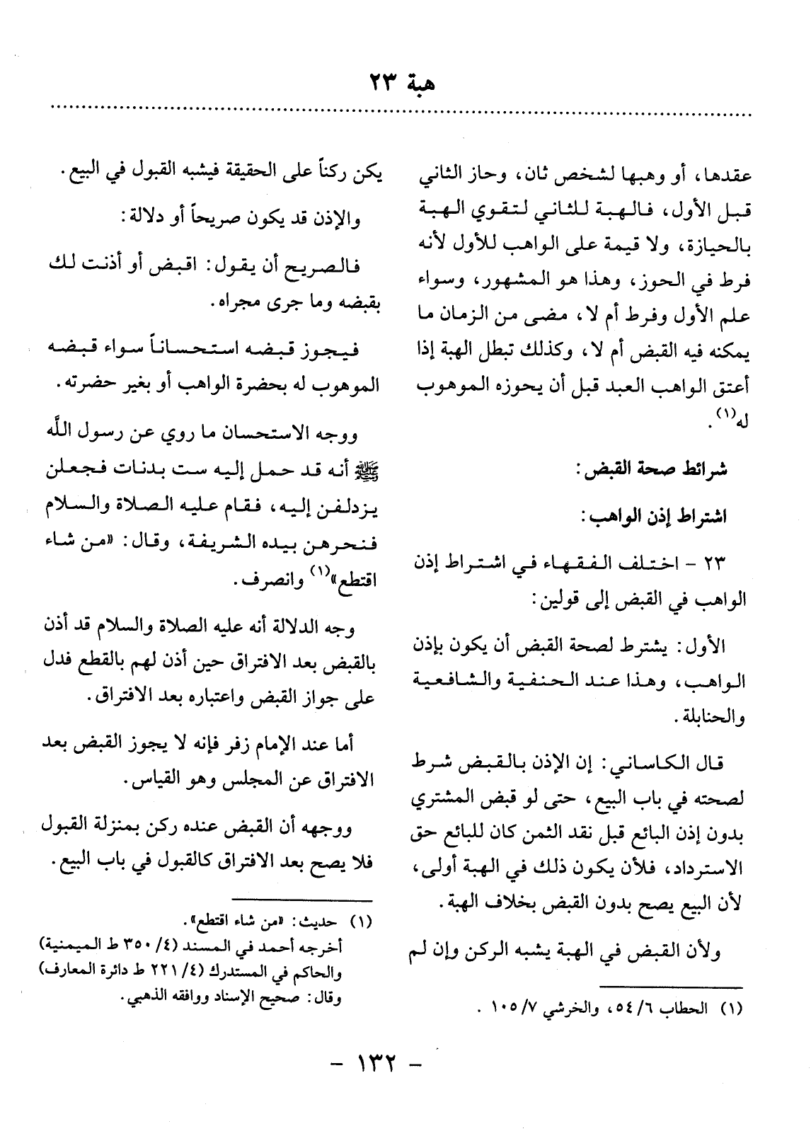 23 - اخْتَلَفَ الْفُقَهَاءُ فِي اشْتِرَاطِ إِذْنِ الْوَاهِبِ فِي الْقَبْضِ إِلَى قَوْلَيْنِ: