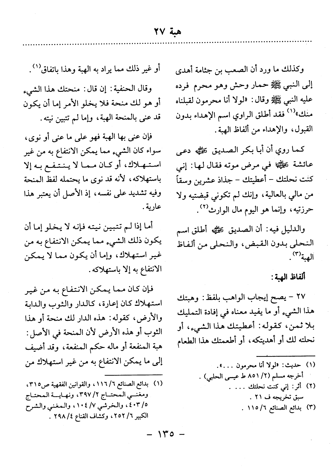 27 - يَصِحُّ إِيجَابُ الْوَاهِبِ بِلَفْظِ: وَهَبْتُكَ هَذَا الشَّيْءَ أَوْ مَا يُفِيدُ مَعْنَاهُ فِي إِفَادَةِ التَّمْلِيكِ بِلاَ ثَمَنٍ، كَقَوْلِهِ: أَعْطَيْتُكَ هَذَا الشَّيْءَ، أَوْ نَحَلْتُهُ لَكَ أَوْ أَهْدَيْتُكَهُ، أَوْ أَطْعَمْتُكَ هَذَا الطَّعَامَ
