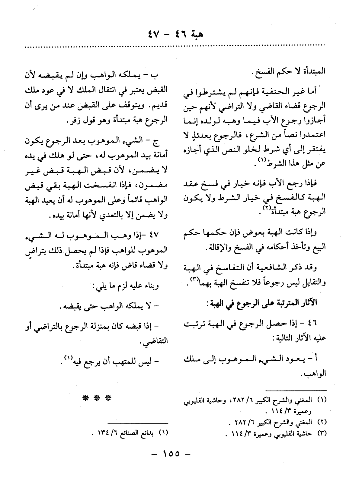 47 - إِذَا وَهَبَ الْمَوْهُوبُ لَهُ الشَّيْءَ الْمَوْهُوبَ لِلْوَاهِبِ فَإِذَا لَمْ يَحْصُل ذَلِكَ بِتَرَاضٍ لاَ قَضَاءِ قَاضٍ فَإِنَّهُ هِبَةٌ مُبْتَدَأَةٌ.