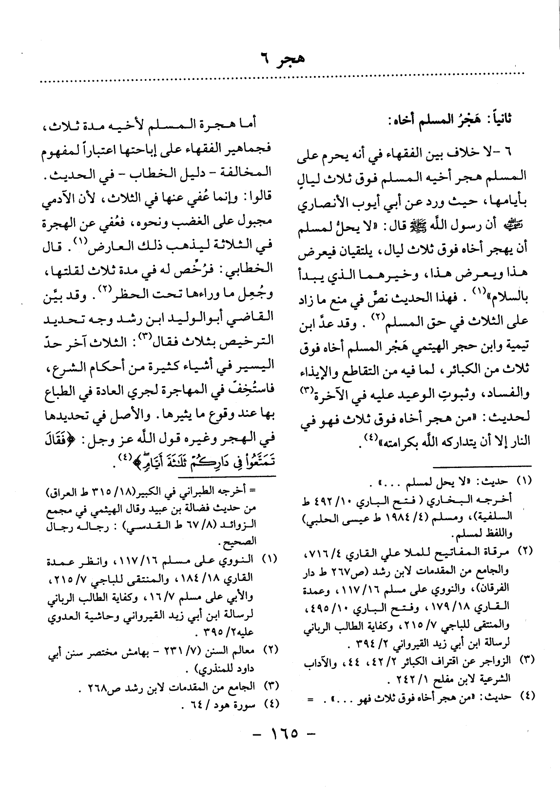 6 - لاَ خِلاَفَ بَيْنَ الْفُقَهَاءِ فِي أَنَّهُ يَحْرُمُ عَلَى الْمُسْلِمِ هَجْرُ أَخِيهِ الْمُسْلِمِ فَوْقَ ثَلاَثِ لَيَالٍ بِأَيَّامِهَا، حَيْثُ وَرَدَ عَنْ أَبِي أَيُّوبَ الأَْنْصَارِيِّ رَضِيَ اللَّهُ عَنْهُ أَنَّ رَسُول اللَّهِ صَلَّى اللَّهُ عَلَيْهِ وَسَلَّمَ قَال: لاَ يَحِل لِمُسْلِمٍ أَنْ يَهْجُرَ أَخَاهُ فَوْقَ ثَلاَثِ لَيَالٍ، يَلْتَقِيَانِ فَيُعْرِضُ هَذَا وَيُعْرِضُ هَذَا، وَخَيْرُهُمَا الَّذِي يَبْدَأُ بِالسَّلاَمِ (1) فَهَذَا الْحَدِيثُ نَصَّ فِي مَنْعِ مَا زَادَ عَلَى الثَّلاَثِ فِي حَقِّ الْمُسْلِمِ (2) وَقَدْ عَدَّ ابْنُ تَيْمِيَّةَ وَابْنُ حَجَرٍ الْهَيْتَمِيُّ هَجْرَ الْمُسْلِمِ أَخَاهُ فَوْقَ ثَلاَثٍ مِنَ الْكَبَائِرِ، لِمَا فِيهِ مِنَ التَّقَاطُعِ وَالإِْيذَاءِ وَالْفَسَادِ، وَثُبُوتِ الْوَعِيدِ عَلَيْهِ فِي الآْخِرَةِ (3) لِحَدِيثِ: مَنْ هَجَرَ أَخَاهُ فَوْقَ ثَلاَثٍ فَهُوَ فِي النَّارِ إِلاَّ أَنْ يَتَدَارَكَهُ اللَّهُ بِكَرَامَتِهِ (4)