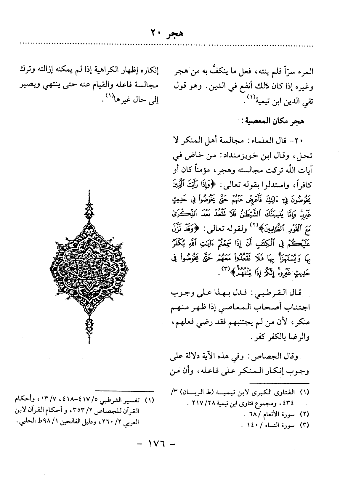 20 - قَال الْعُلَمَاءُ: مُجَالَسَةُ أَهْل الْمُنْكَرِ لاَ تَحِل، وَقَال ابْنُ خُوَيْزِ مَنْدَادُ: مَنْ خَاضَ فِي آيَاتِ اللَّهِ تُرِكَتْ مُجَالَسَتُهُ وَهُجِرَ، مُؤْمِنًا كَانَ أَوْ كَافِرًا، وَاسْتَدَلُّوا بِقَوْلِهِ تَعَالَى: {وَإِذَا رَأَيْتَ الَّذِينَ يَخُوضُونَ فِي آيَاتِنَا فَأَعْرِضْ عَنْهُمْ حَتَّى يَخُوضُوا فِي حَدِيثٍ غَيْرِهِ وَإِمَّا يُنْسِيَنَّكَ الشَّيْطَانُ فَلاَ تَقْعُدْ بَعْدَ الذِّكْرَى مَعَ الْقَوْمِ الظَّالِمِينَ (2) } . وَلِقَوْلِهِ تَعَالَى: {وَقَدْ نَزَّل عَلَيْكُمْ فِي الْكِتَابِ أَنْ إِذَا سَمِعْتُمْ آيَاتِ اللَّهِ يُكْفَرُ بِهَا وَيُسْتَهْزَأُ بِهَا فَلاَ تَقْعُدُوا مَعَهُمْ حَتَّى يَخُوضُوا فِي حَدِيثٍ غَيْرِهِ إِنَّكُمْ إِذًا مِثْلُهُمْ (3) } .
