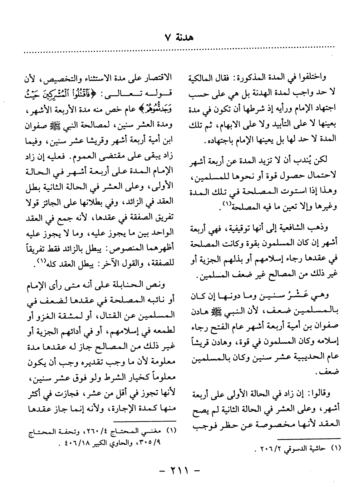 وَاخْتَلَفُوا فِي الْمُدَّةِ الْمَذْكُورَةِ: فَقَال الْمَالِكِيَّةُ لاَ حَدَّ وَاجِبٌ لِمُدَّةِ الْهُدْنَةِ بَل هِيَ عَلَى حَسَبِ اجْتِهَادِ الإِْمَامِ وَرَأْيِهِ؛ إِذْ شَرْطُهَا أَنْ تَكُونَ فِي مُدَّةٍ بِعَيْنِهَا لاَ عَلَى التَّأْبِيدِ وَلاَ عَلَى الإِْبْهَامِ، ثُمَّ تِلْكَ الْمُدَّةُ لاَ حَدَّ لَهَا بَل يُعَيِّنُهَا الإِْمَامُ بِاجْتِهَادِهِ.