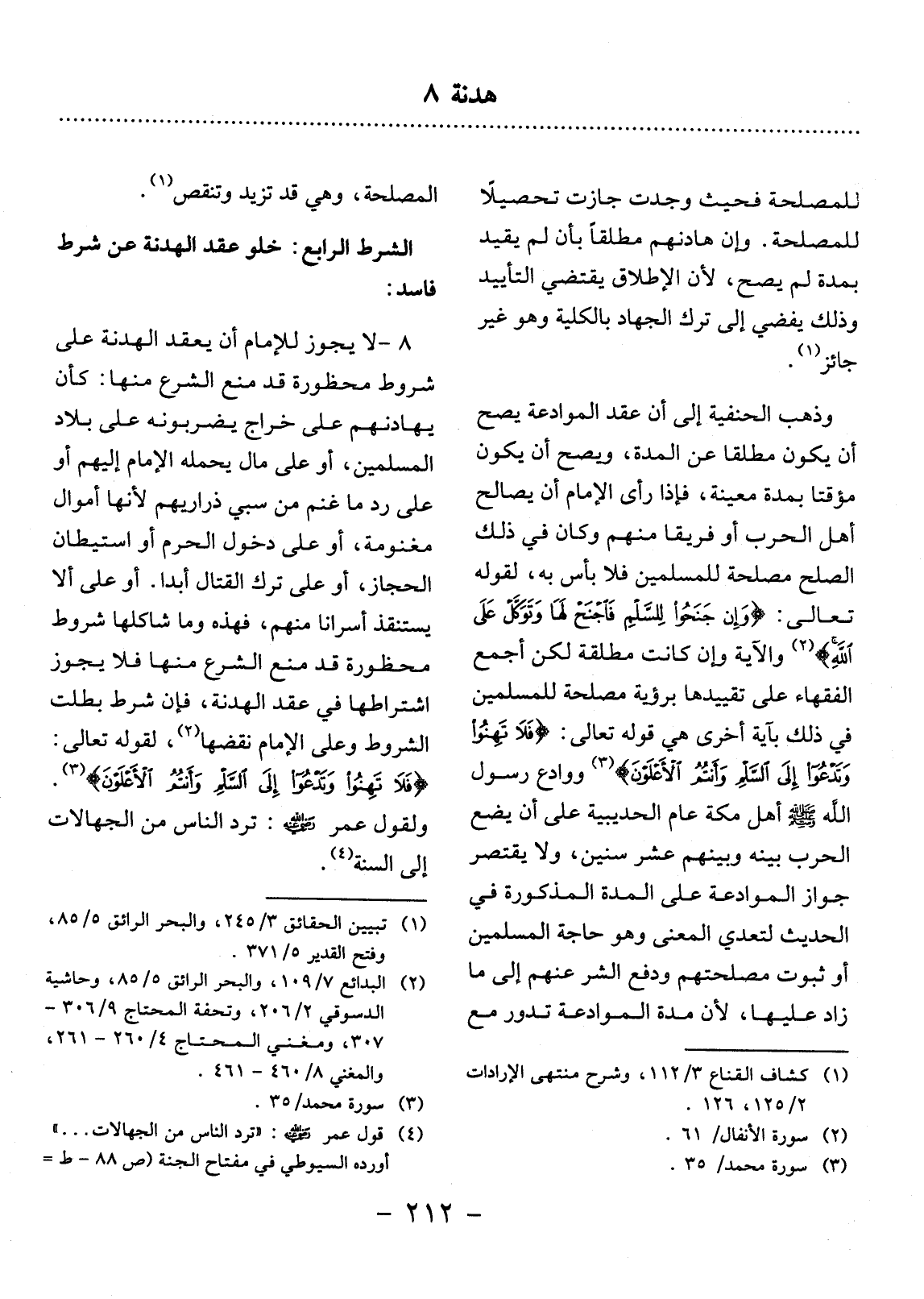8 - لاَ يَجُوزُ لِلإِْمَامِ أَنْ يَعْقِدَ الْهُدْنَةَ عَلَى شُرُوطٍ مَحْظُورَةٍ قَدْ مَنَعَ الشَّرْعُ مِنْهَا: كَأَنْ يُهَادِنَهُمْ عَلَى خَرَاجٍ يَضْرِبُونَهُ عَلَى بِلاَدِ الْمُسْلِمِينَ، أَوْ عَلَى مَالٍ يَحْمِلُهُ الإِْمَامُ إِلَيْهِمْ أَوْ عَلَى رَدِّ مَا غَنِمَ مِنْ سَبِّيِ ذَرَارِيهِمْ؛ لأَِنَّهَا أَمْوَالٌ مَغْنُومَةٌ، أَوْ عَلَى دُخُول الْحَرَمِ أَوِ اسْتِيطَانِ الْحِجَازِ، أَوْ عَلَى تَرْكِ الْقِتَال أَبَدًا. أَوْ عَلَى أَلاَّ يَسْتَنْقِذَ أَسْرَانَا مِنْهُمْ، فَهَذِهِ وَمَا شَاكَلَهَا شُرُوطٌ مَحْظُورَةٌ قَدْ مَنَعَ الشَّرْعُ مِنْهَا فَلاَ يَجُوزُ اشْتِرَاطُهَا فِي عَقْدِ الْهُدْنَةِ، فَإِنْ شَرَطَ بَطَلَتِ الشُّرُوطُ وَعَلَى الإِْمَامِ نَقْضُهَا (2) ، لِقَوْلِهِ تَعَالَى: {فَلاَ تَهِنُوا وَتَدْعُوا إِلَى السَّلْمِ وَأَنْتُمُ الأَْعْلَوْنَ (3) } وَلِقَوْل عُمَرَ رَضِيَ اللَّهُ عَنْهُ: تُرَدُّ النَّاسُ مِنَ الْجَهَالاَتِ إِلَى السُّنَّةِ (4) .