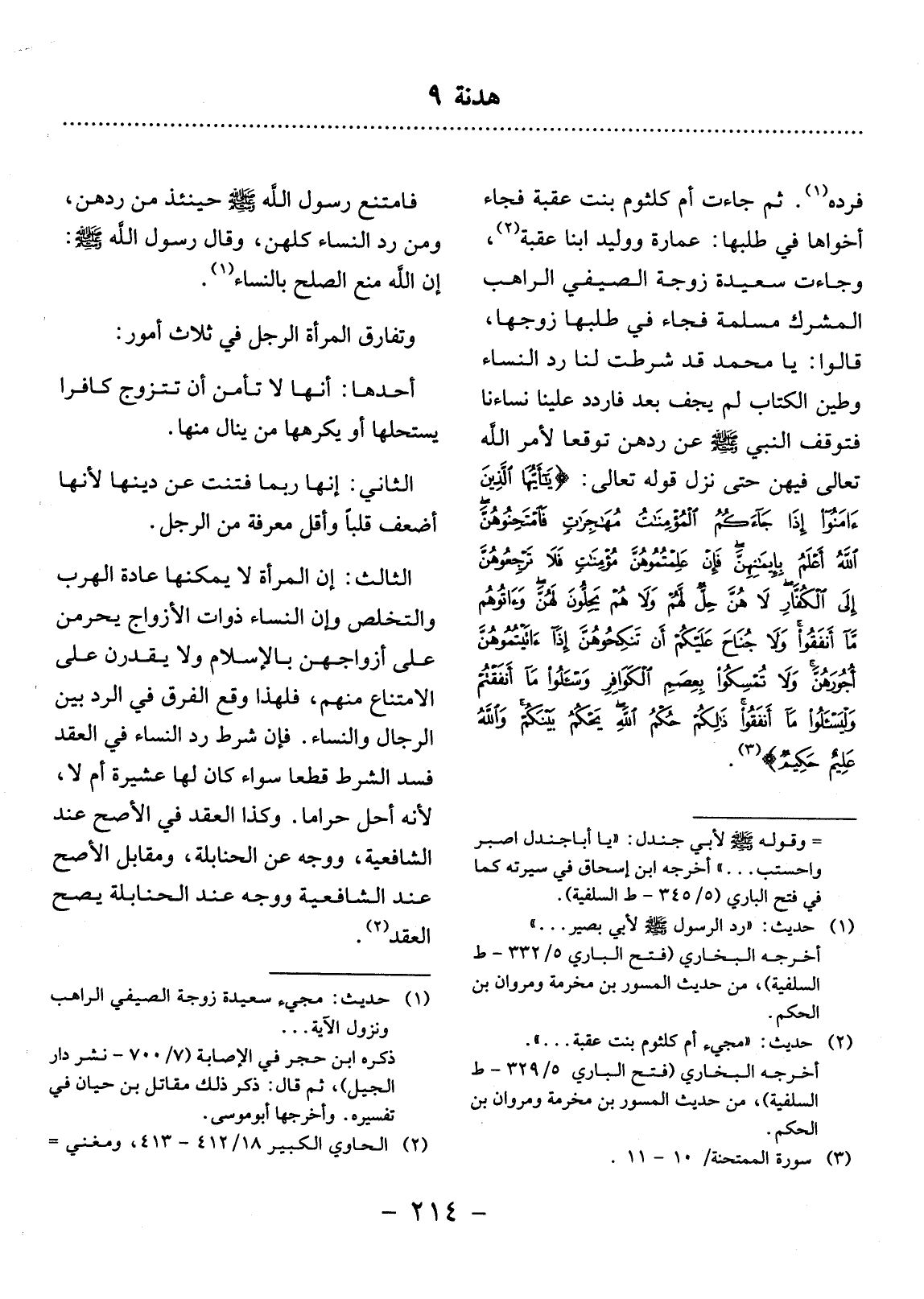 فَرَدَّهُ (1) . ثُمَّ جَاءَتْ أُمُّ كُلْثُومٍ بِنْتُ عُقْبَةَ فَجَاءَ أَخَوَاهَا فِي طَلَبِهَا: عُمَارَةُ وَوَلِيدٌ ابْنَا عُقْبَةَ (2) ، وَجَاءَتْ سَعِيدَةُ زَوْجَةُ الصَّيْفِيِّ الرَّاهِبِ الْمُشْرِكِ مَسْلَمَةً فَجَاءَ فِي طَلَبِهَا زَوْجُهَا، قَالُوا: يَا مُحَمَّدُ قَدْ شَرَطْتَ لَنَا رَدَّ النِّسَاءِ وَطِينُ الْكِتَابِ لَمْ يَجِفَّ بَعْدُ فَارْدُدْ عَلَيْنَا نِسَاءَنَا فَتَوَقَّفَ النَّبِيُّ صَلَّى اللَّهُ عَلَيْهِ وَسَلَّمَ عَنْ رَدِّهِنَّ تَوَقُّعًا لأَِمْرِ اللَّهِ تَعَالَى فِيهِنَّ حَتَّى نَزَل قَوْلُهُ تَعَالَى: {يَا أَيُّهَا الَّذِينَ آمَنُوا إِذَا جَاءَكُمُ الْمُؤْمِنَاتُ مُهَاجِرَاتٍ فَامْتَحِنُوهُنَّ اللَّهُ أَعْلَمُ بِإِيمَانِهِنَّ فَإِنْ عَلِمْتُمُوهُنَّ مُؤْمِنَاتٍ فَلاَ تَرْجِعُوهُنَّ إِلَى الْكُفَّارِ لاَ هُنَّ حِلٌّ لَهُمْ وَلاَ هُمْ يَحِلُّونَ لَهُنَّ وَآتُوهُمْ مَا أَنْفَقُوا وَلاَ جُنَاحَ عَلَيْكُمْ أَنْ تَنْكِحُوهُنَّ إِذَا آتَيْتُمُوهُنَّ أُجُورَهُنَّ وَلاَ تُمْسِكُوا بِعِصَمِ الْكَوَافِرِ وَاسْأَلُوا مَا أَنْفَقْتُمْ وَلْيَسْأَلُوا مَا أَنْفَقُوا ذَلِكُمْ حُكْمُ اللَّهِ يَحْكُمُ بَيْنَكُمْ وَاللَّهُ عَلِيمٌ حَكِيمٌ (3) } .