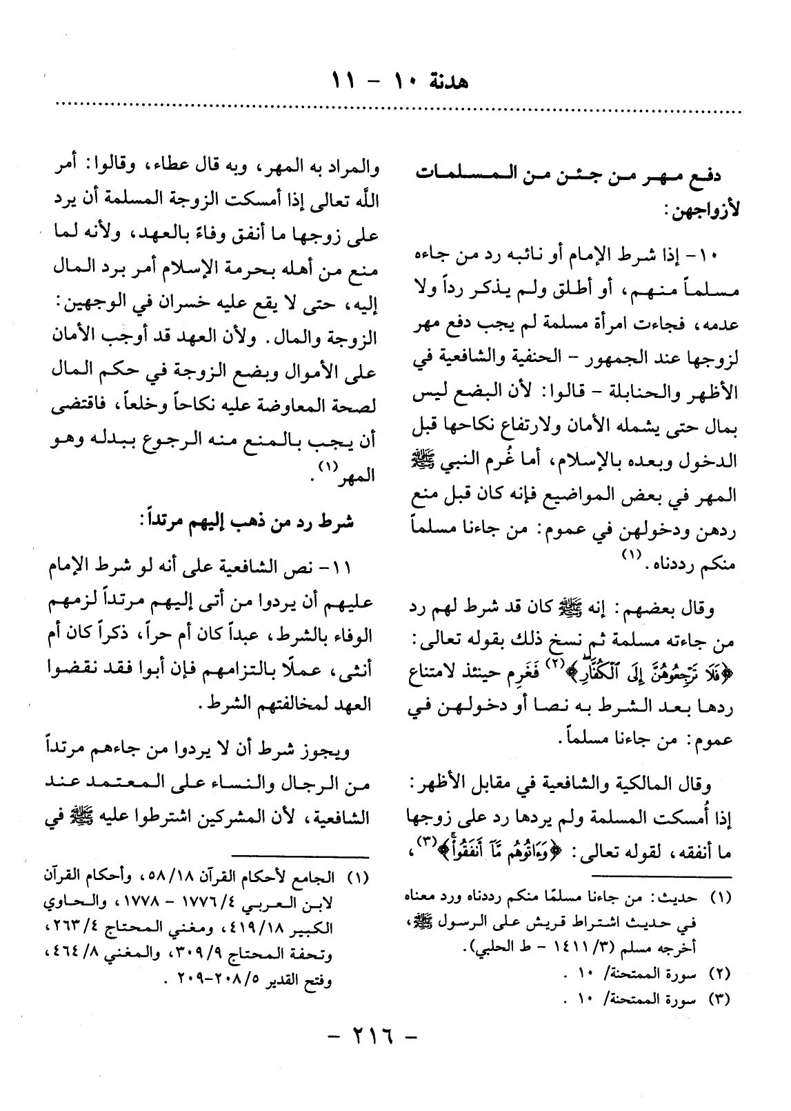10 - إِذَا شَرَطَ الإِْمَامُ أَوْ نَائِبُهُ رَدَّ مَنْ جَاءَهُ مُسْلِمًا مِنْهُمْ، أَوْ أَطْلَقَ وَلَمْ يَذْكُرْ رَدًّا وَلاَ عَدَمَهُ، فَجَاءَتِ امْرَأَةٌ مُسْلِمَةٌ لَمْ يَجِبْ دَفْعُ مَهْرٍ لِزَوْجِهَا عِنْدَ الْجُمْهُورِ - الْحَنَفِيَّةِ وَالشَّافِعِيَّةِ فِي الأَْظْهَرِ وَالْحَنَابِلَةِ - قَالُوا: لأَِنَّ الْبُضْعَ لَيْسَ بِمَالٍ حَتَّى يَشْمَلَهُ الأَْمَانُ وَلاِرْتِفَاعِ نِكَاحِهَا قَبْل الدُّخُول وَبَعْدَهُ بِالإِْسْلاَمِ، أَمَّا غُرْمُ النَّبِيِّ صَلَّى اللَّهُ عَلَيْهِ وَسَلَّمَ الْمَهْرَ فِي بَعْضِ الْمَوَاضِيعِ فَإِنَّهُ كَانَ قَبْل مَنْعِ رَدِّهِنَّ وَدُخُولِهِنَّ فِي عُمُومِ: مَنْ جَاءَنَا مُسْلِمًا مِنْكُمْ رَدَدْنَاهُ (1) .