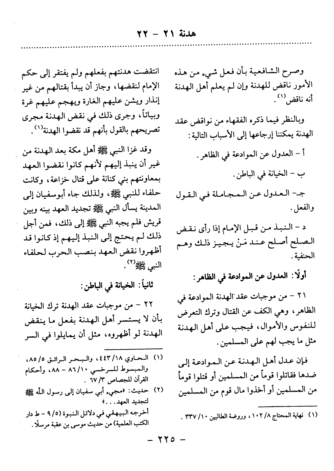 22 - مِنْ مُوجِبَاتِ عَقْدِ الْهُدْنَةِ تَرْكُ الْخِيَانَةِ بِأَنْ لاَ يَسْتَسِرَّ أَهْل الْهُدْنَةِ بِفِعْلٍ مَا يَنْقُضُ الْهُدْنَةَ لَوْ أَظْهَرُوهُ، مِثْل أَنْ يُمَايِلُوا فِي السِّرِّ