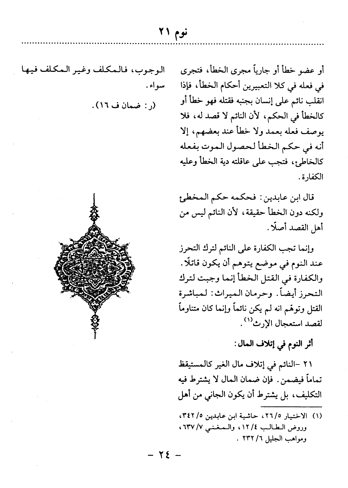 21 - النَّائِمُ فِي إِتْلاَفِ مَال الْغَيْرِ كَالْمُسْتَيْقِظِ تَمَامًا فَيَضْمَنُ. فَإِنَّ ضَمَانَ الْمَال لاَ يُشْتَرَطُ فِيهِ التَّكْلِيفُ، بَل يُشْتَرَطُ أَنْ يَكُونَ الْجَانِي مِنْ أَهْل