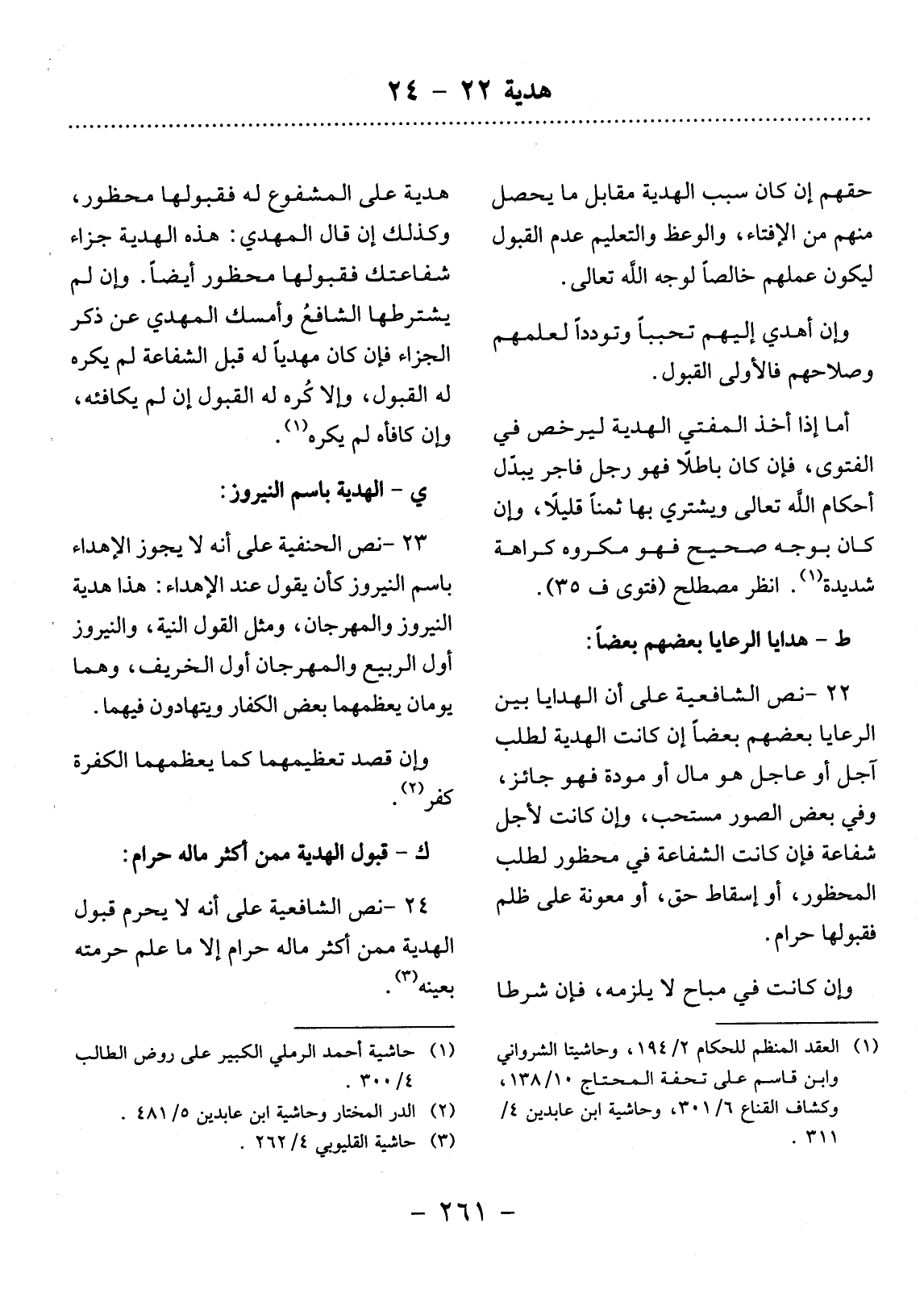 22 - نَصَّ الشَّافِعِيَّةُ عَلَى أَنَّ الْهَدَايَا بَيْنَ الرَّعَايَا بَعْضِهِمْ بَعْضًا إِنْ كَانَتِ الْهَدِيَّةُ لِطَلَبٍ آجِلٍ أَوْ عَاجِلٍ هُوَ مَالٌ أَوْ مَوَدَّةٌ فَهُوَ جَائِزٌ، وَفِي بَعْضِ الصُّوَرِ مُسْتَحَبٌّ، وَإِنْ كَانَتْ لأَِجْل شَفَاعَةٍ فَإِنْ كَانَتِ الشَّفَاعَةُ فِي مَحْظُورٍ لِطَلَبِ الْمَحْظُورِ، أَوْ إِسْقَاطِ حَقٍّ، أَوْ مَعُونَةٍ عَلَى ظُلْمٍ فَقَبُولُهَا حَرَامٌ.