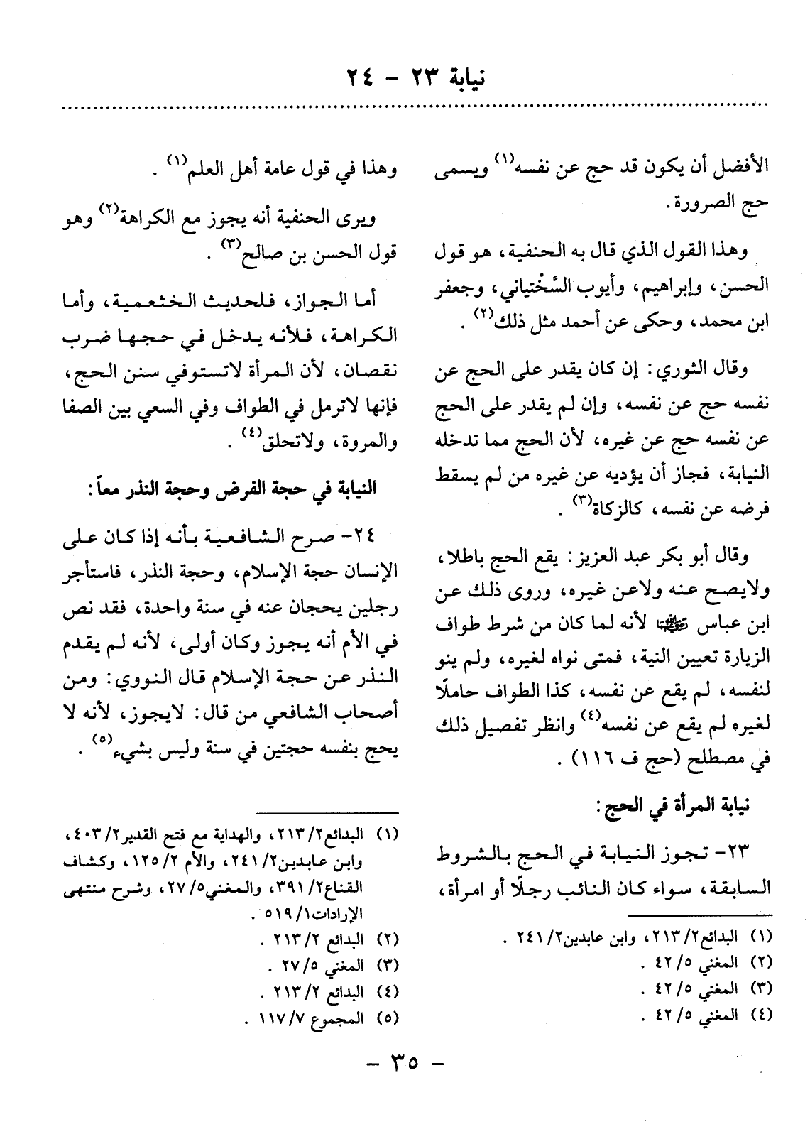 23 - تَجُوزُ النِّيَابَةُ فِي الْحَجِّ بِالشُّرُوطِ السَّابِقَةِ، سَوَاءٌ كَانَ النَّائِبُ رَجُلاً أَوِ امْرَأَةً،