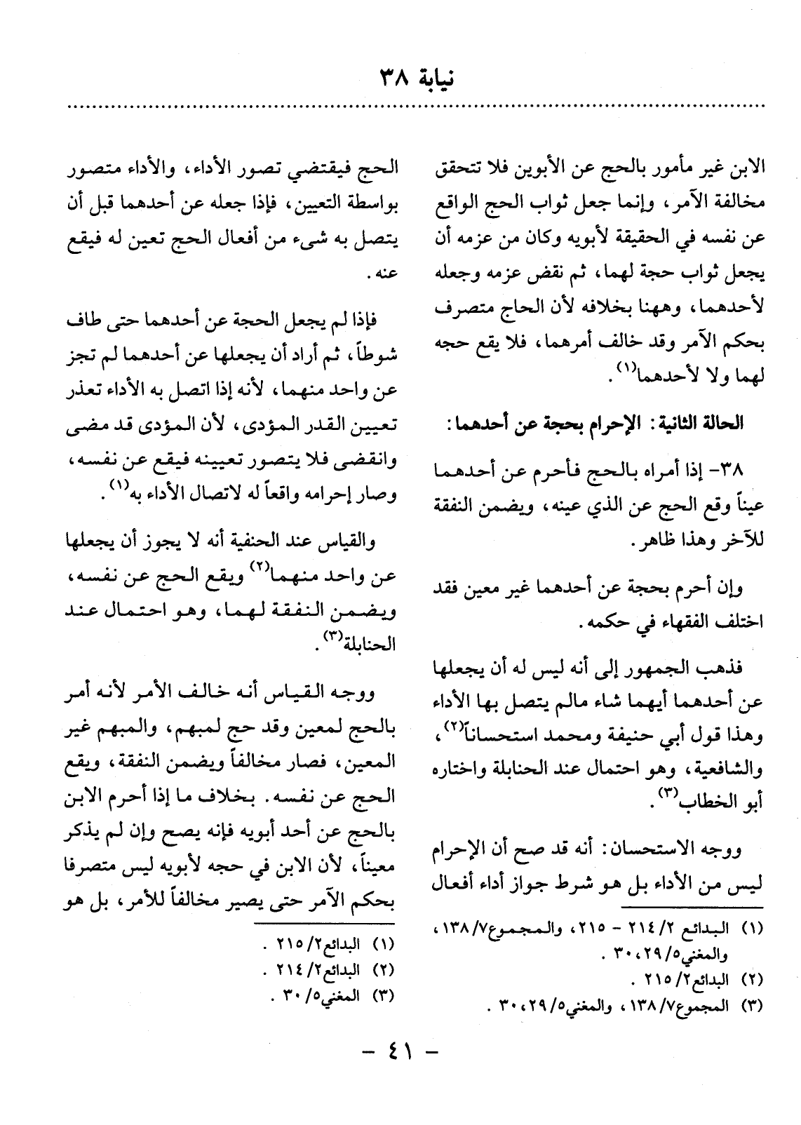 38 - إِذَا أَمَرَاهُ بِالْحَجِّ فَأَحْرَمَ عَنْ أَحَدِهِمَا عَيْنًا وَقَعَ الْحَجُّ عَنِ الَّذِي عَيَّنَهُ، وَيَضْمَنُ النَّفَقَةَ لِلآْخَرِ وَهَذَا ظَاهِرٌ.