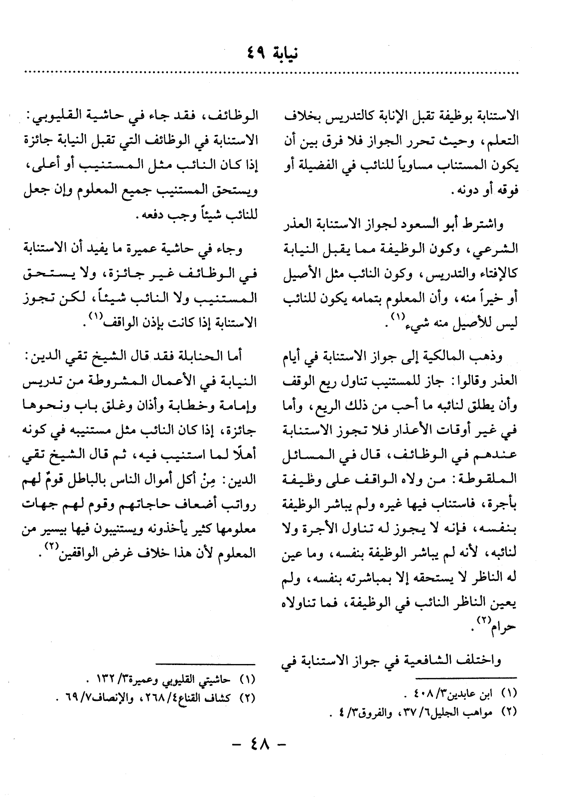 وَجَاءَ فِي حَاشِيَةِ عَمِيرَةَ مَا يُفِيدُ أَنَّ الاِسْتِنَابَةَ فِي الْوَظَائِفِ غَيْرُ جَائِزَةٍ، وَلاَ يَسْتَحِقُّ الْمُسْتَنِيبُ وَلاَ النَّائِبُ شَيْئًا، لَكِنْ تَجُوزُ الاِسْتِنَابَةُ إِذَا كَانَتْ بِإِذْنِ الْوَاقِفِ (1) .