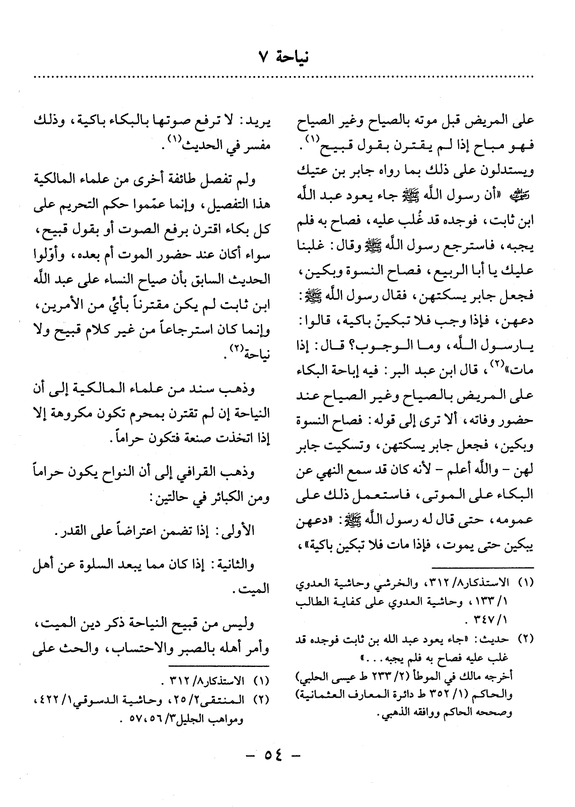 وَلَمْ تُفَصِّل طَائِفَةٌ أُخْرَى مِنْ عُلَمَاءِ الْمَالِكِيَّةِ هَذَا التَّفْصِيل، وَإِنَّمَا عَمَّمُوا حُكْمَ التَّحْرِيمِ عَلَى كُل بُكَاءٍ اقْتَرَنَ بِرَفْعِ الصَّوْتِ أَوْ بِقَوْلٍ قَبِيحٍ، سَوَاءٌ أَكَانَ عِنْدَ حُضُورِ الْمَوْتِ أَمْ بَعْدَهُ، وَأَوَّلُوا الْحَدِيثَ السَّابِقَ بِأَنَّ صِيَاحَ النِّسَاءِ عَلَى عَبْدِ اللَّهِ بْنِ ثَابِتٍ لَمْ يَكُنْ مُقْتَرِنًا بِأَيٍّ مِنَ الأَْمْرَيْنِ، وَإِنَّمَا كَانَ اسْتِرْجَاعًا مِنْ غَيْرِ كَلاَمٍ قَبِيحٍ وَلاَ نِيَاحَةٍ (2) .