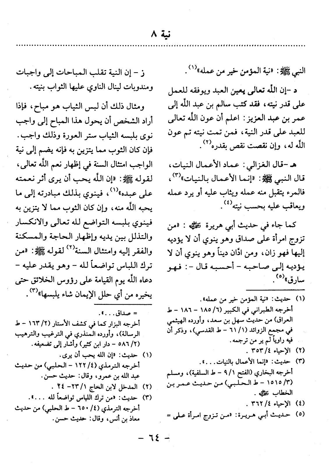 ز - إِنَّ النِّيَّةَ تَقْلِبُ الْمُبَاحَاتِ إِلَى وَاجِبَاتٍ وَمَنْدُوبَاتٍ لِيَنَال النَّاوِي عَلَيْهَا الثَّوَابَ بِنِيَّتِهِ.
