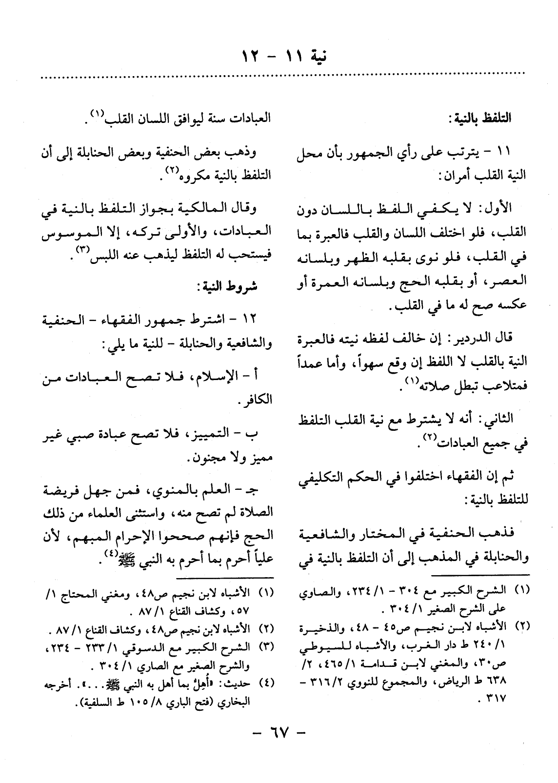12 - اشْتَرَطَ جُمْهُورُ الْفُقَهَاءِ - الْحَنَفِيَّةُ وَالشَّافِعِيَّةُ وَالْحَنَابِلَةُ - لِلنِّيَّةِ مَا يَلِي: