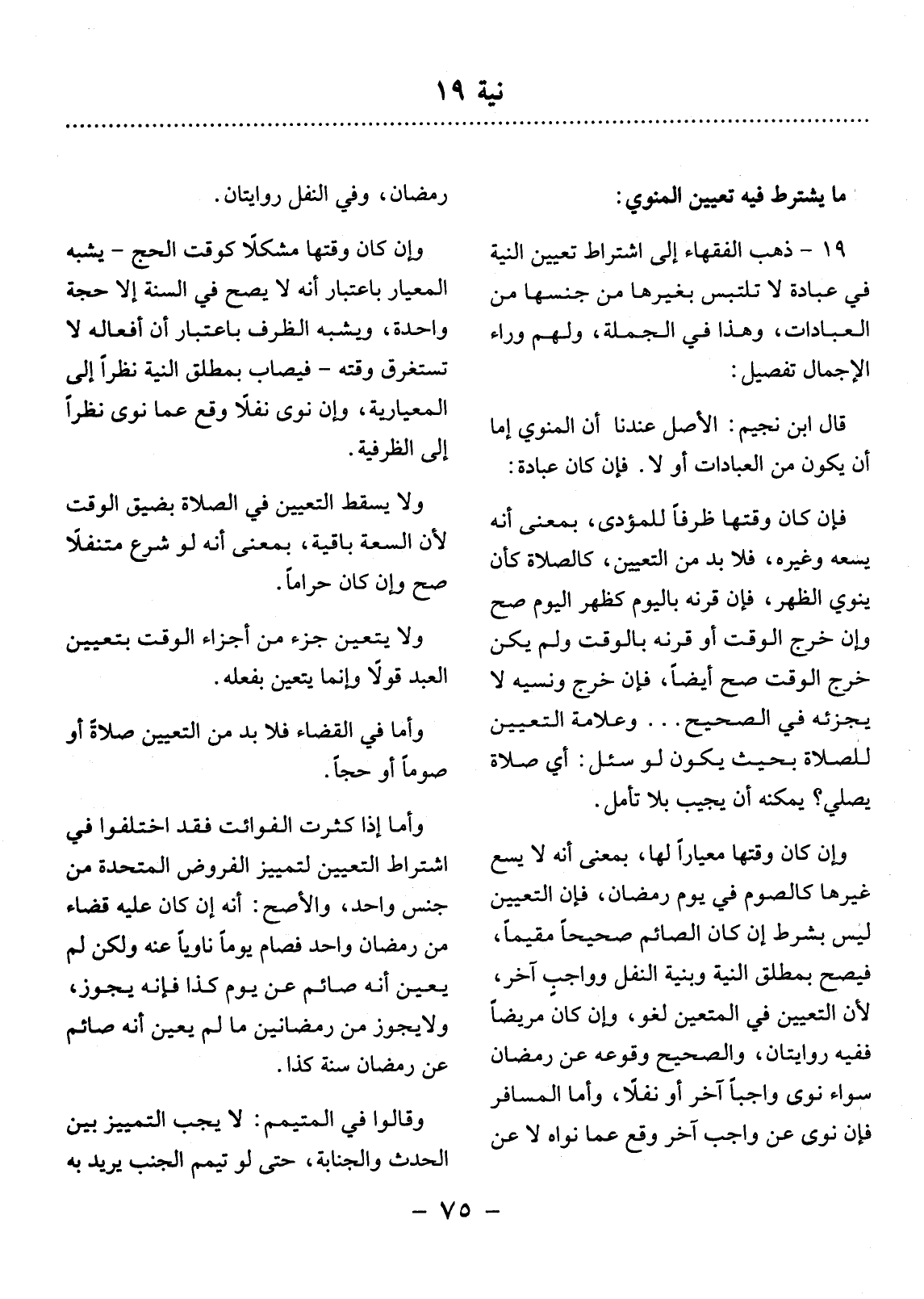 19 - ذَهَبَ الْفُقَهَاءُ إِلَى اشْتِرَاطِ تَعْيِينِ النِّيَّةِ فِي عِبَادَةٍ لاَ تَلْتَبِسُ بِغَيْرِهَا مِنْ جِنْسِهَا مِنَ الْعِبَادَاتِ، وَهَذَا فِي الْجُمْلَةِ، وَلَهُمْ وَرَاءَ الإِْجْمَال تَفْصِيلٌ: