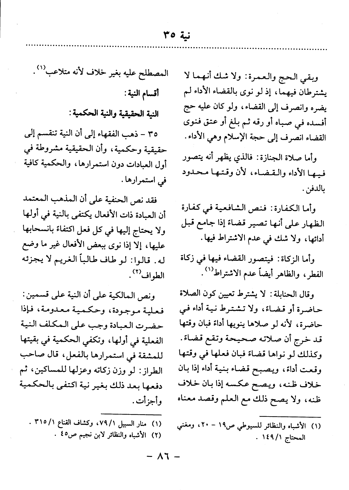 35 - ذَهَبَ الْفُقَهَاءُ إِلَى أَنَّ النِّيَّةَ تَنْقَسِمُ إِلَى حَقِيقِيَّةٍ وَحُكْمِيَّةٍ، وَأَنَّ الْحَقِيقِيَّةَ مَشْرُوطَةٌ فِي أَوَّل الْعِبَادَاتِ دُونَ اسْتِمْرَارِهَا، وَالْحُكْمِيَّةَ كَافِيَةٌ فِي اسْتِمْرَارِهَا.