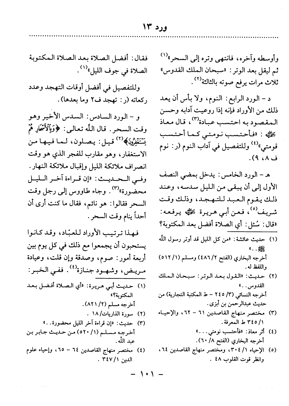 وـ الْوِرْدُ السَّادِسُ: السُّدُسُ الأَْخِيرُ وَهُوَ وَقْتُ السَّحَرِ. قَال اللَّهُ تَعَالَى: {وَبِالأَْسْحَارِ هُمْ يَسْتَغْفِرُونَ (2) } قِيل: يُصَلُّونَ، لِمَا فِيهَا مِنْ الاِسْتِغْفَارِ، وَهُوَ مُقَارِبٌ لِلْفَجْرِ الَّذِي هُوَ وَقْتُ انْصِرَافِ مَلاَئِكَةِ اللَّيْل وَإِقْبَال مَلاَئِكَةِ النَّهَارِ. وَفِي الْحَدِيثِ: إِنَّ قِرَاءَةَ آخِرِ اللَّيْل مَحْضُورَةٌ (3) . وَجَاءَ طَاوُسٌ إِلَى رَجُلٍ وَقْتَ السَّحَرِ فَقَالُوا: هُوَ نَائِمٌ، فَقَال: مَا كُنْتُ أَرَى أَنَّ أَحَدًا يَنَامُ وَقْتَ السَّحَرِ.